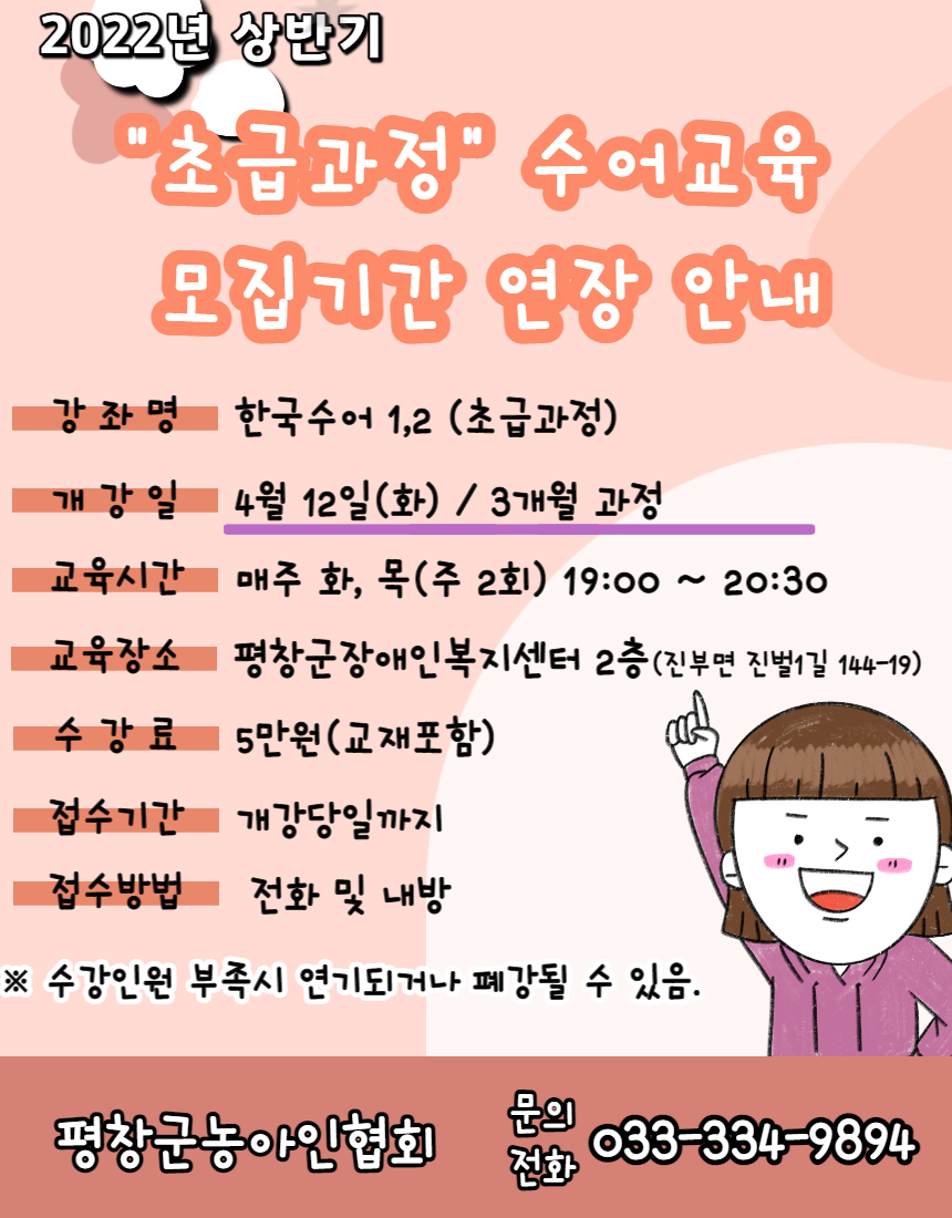4. 교육장소: 평창군농아인협회 교육실(진부면 진벌1길 144-19, 평창군장애인복지센터 2층)5. 교육문의: 033-334-9894* 접수인원 미달시 폐강되거나, 연기될 수 있습니다.많은 관심과 신청 부탁드립니다.