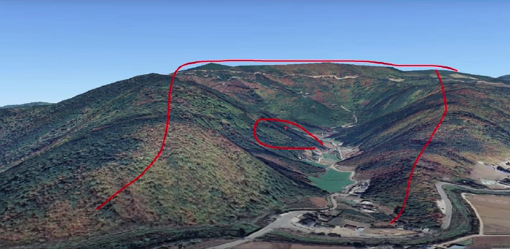 *토지 주변상황: 해피700활공장 입구로 토지 전면에 세 가구가 인접해 있으며 주변에 10여 가구와 밭으로 연결됨