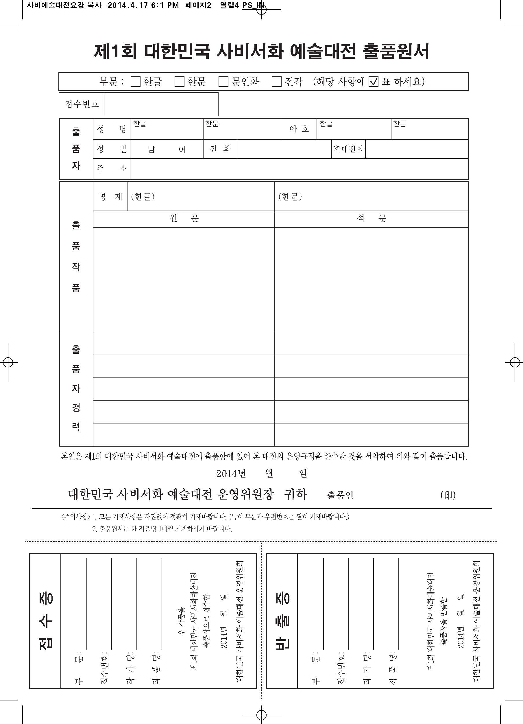 - 공모부문 : 서예(한글, 한문), 전각, 문인화