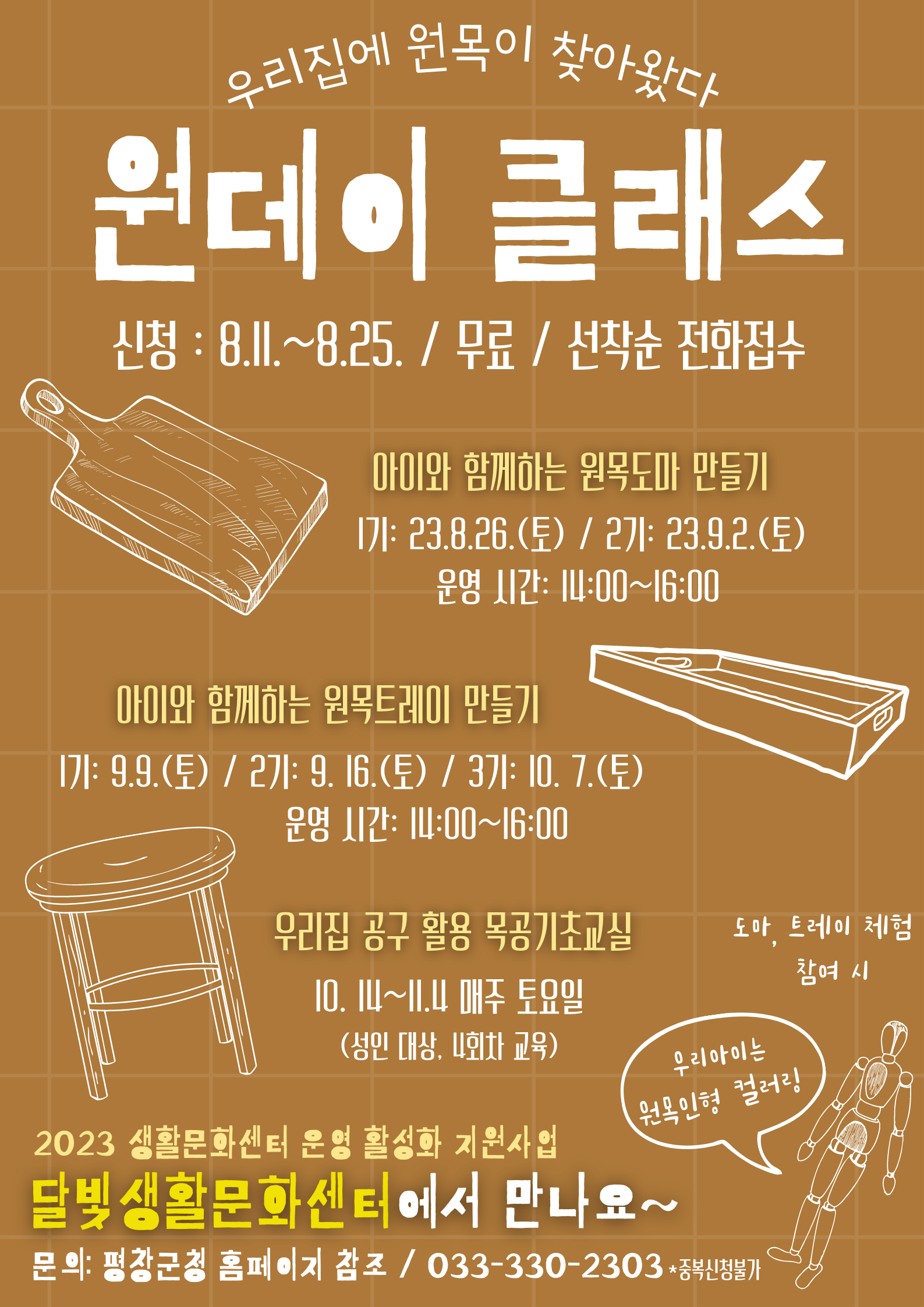 * 모집인원: 도마, 트레이- 각 기수당 12팀 / 목공기초교실 - 15명