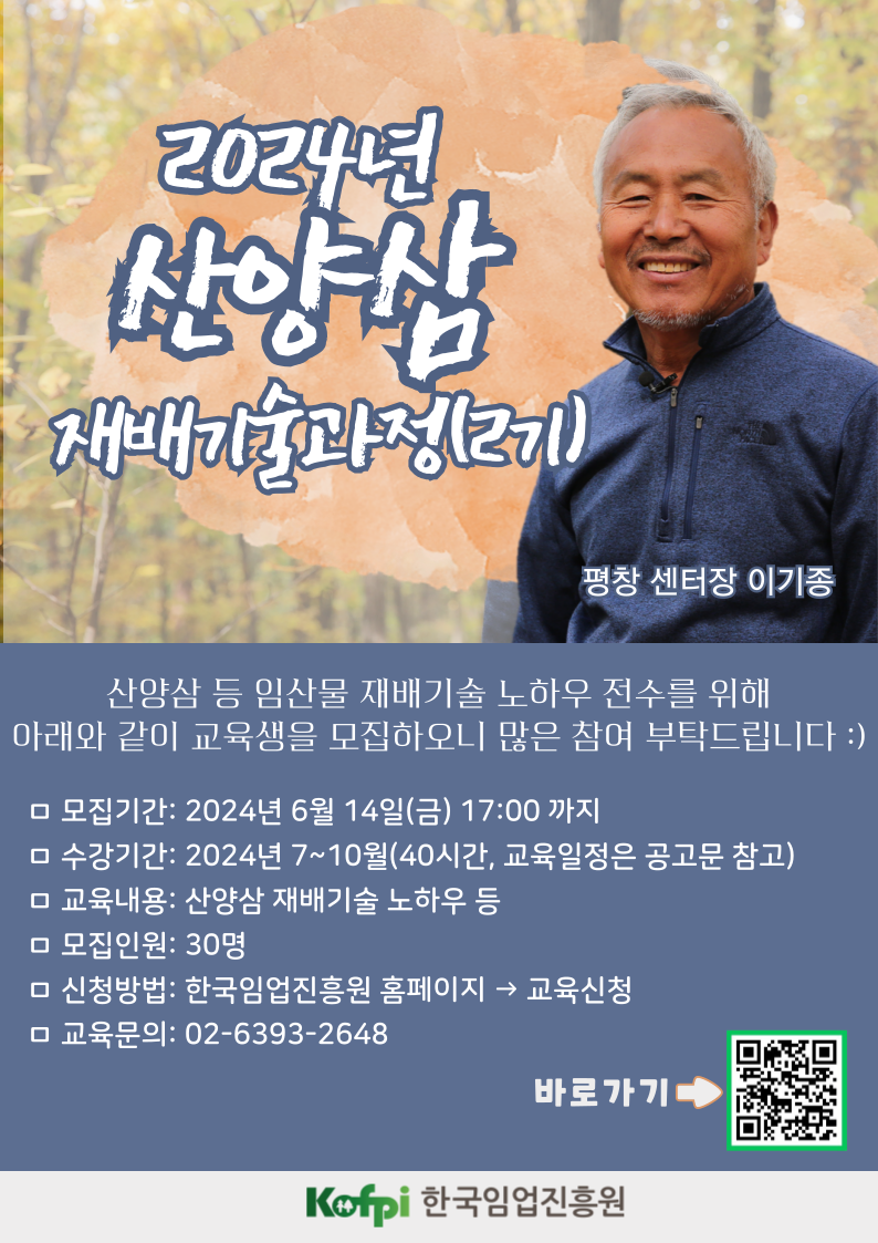 한국임업진흥원 평창 교육센터에서 「산양삼 재배기술과정(2기)」 교육생을 모집하고 있습니다. 모집 기간은 6월 14일 오후 5시까지입니다. 산양삼 재배에 관심 있는 분들의 많은 관심과 신청 부탁드립니다.