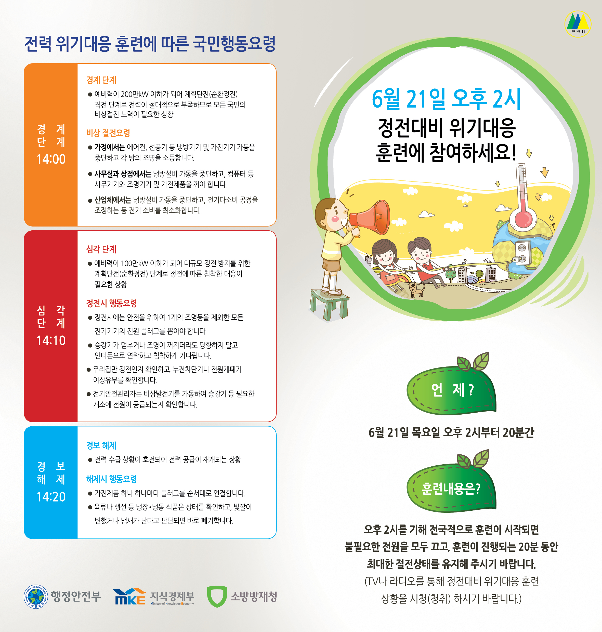 최근 전련수급 여건이 어려워짐에 따라 향후 발생할 수 있는 비상상황에 대한 대비태세 점검을 위하여 2012. 6. 21(목) 오후 2시부터 20분간 정전대비 위기대응 훈련을 실시할 계획입니다.