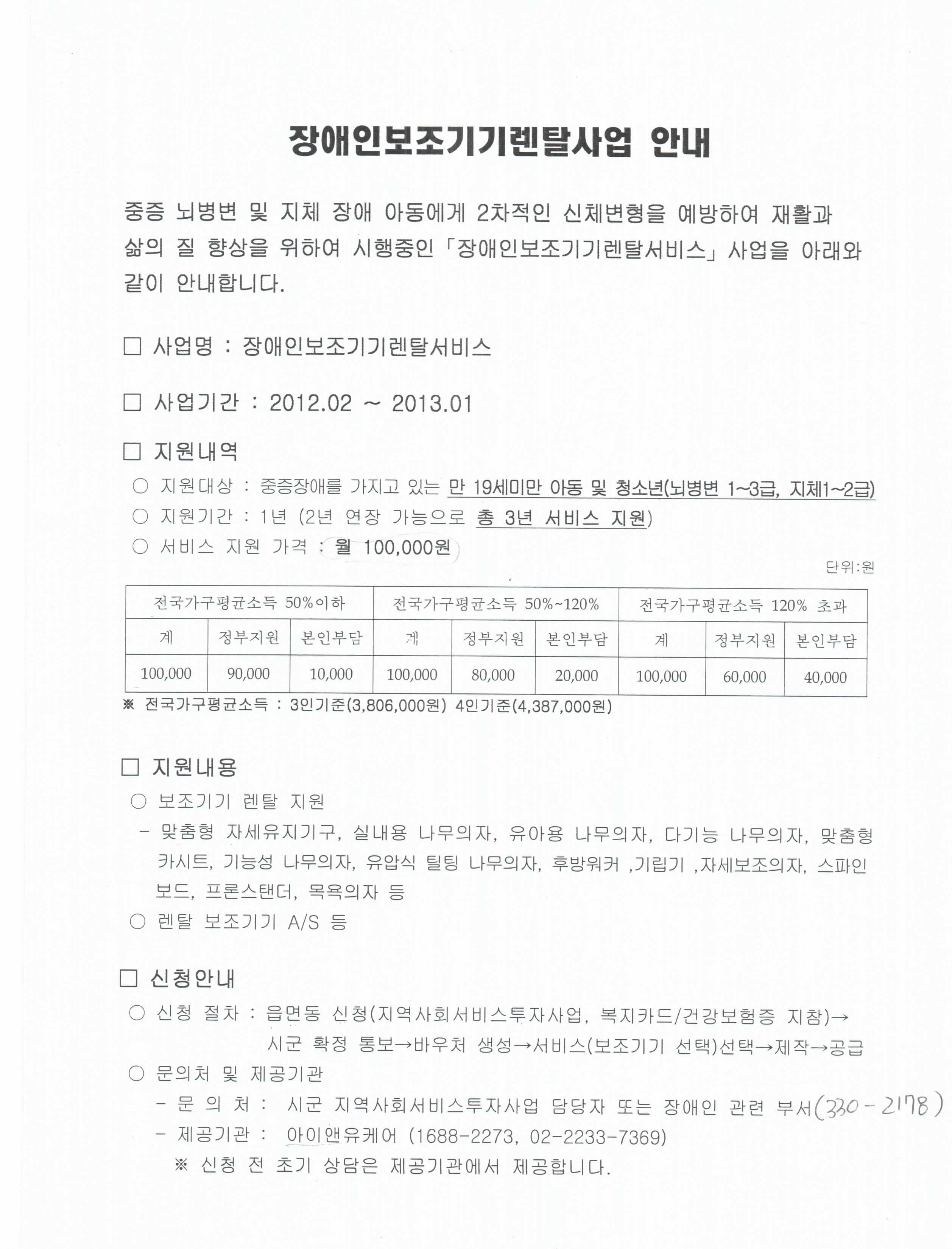 중증 뇌병변 및 지체장애 아동에게 재활과 삶의 질 향상을 위하여 실시하고 있는 "장애인보조기기렌탈서비스사업"을 붙임과 같이 알려드리니 많은 신청 바랍니다.