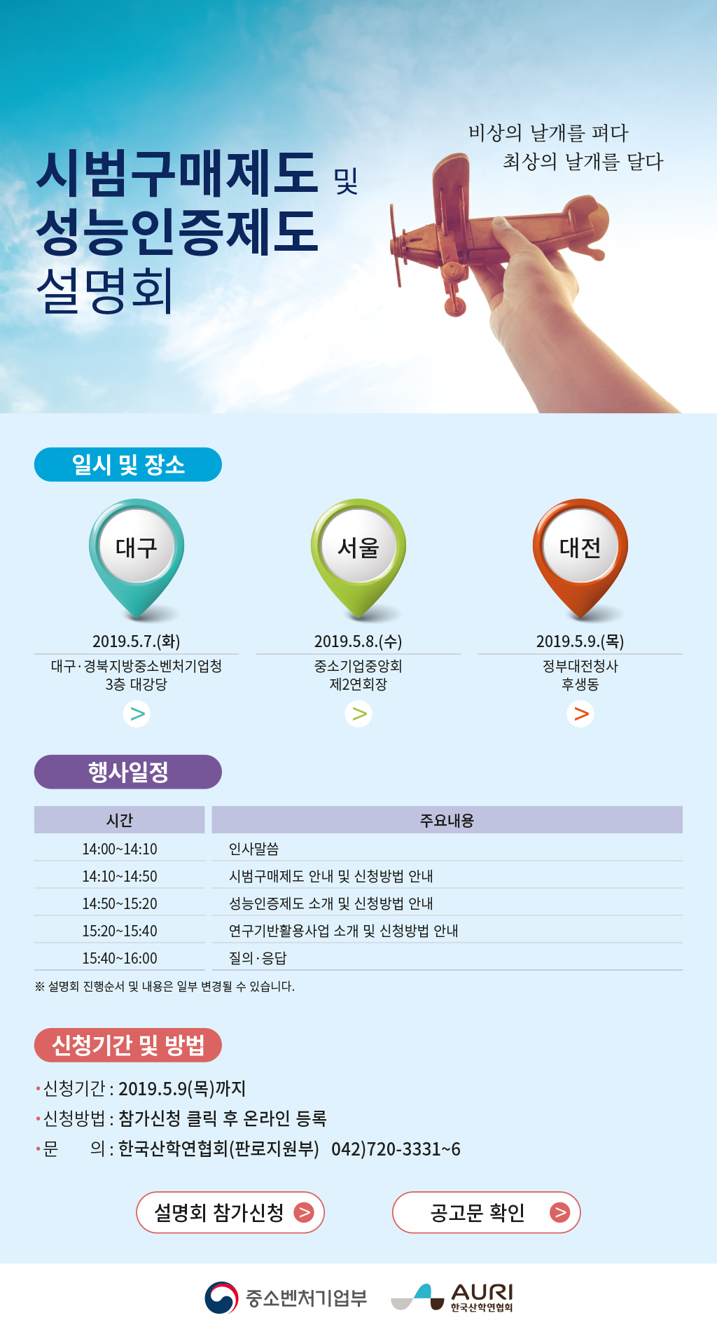 공공조달시장을 통해 창업기업과 공공조달시장 첫걸음기업의 판로 개척을 지원하는「2019년 기술개발제품 시범구매 지원계획」을 다음과 같이 공고하오니 많은 참여 바랍니다.
