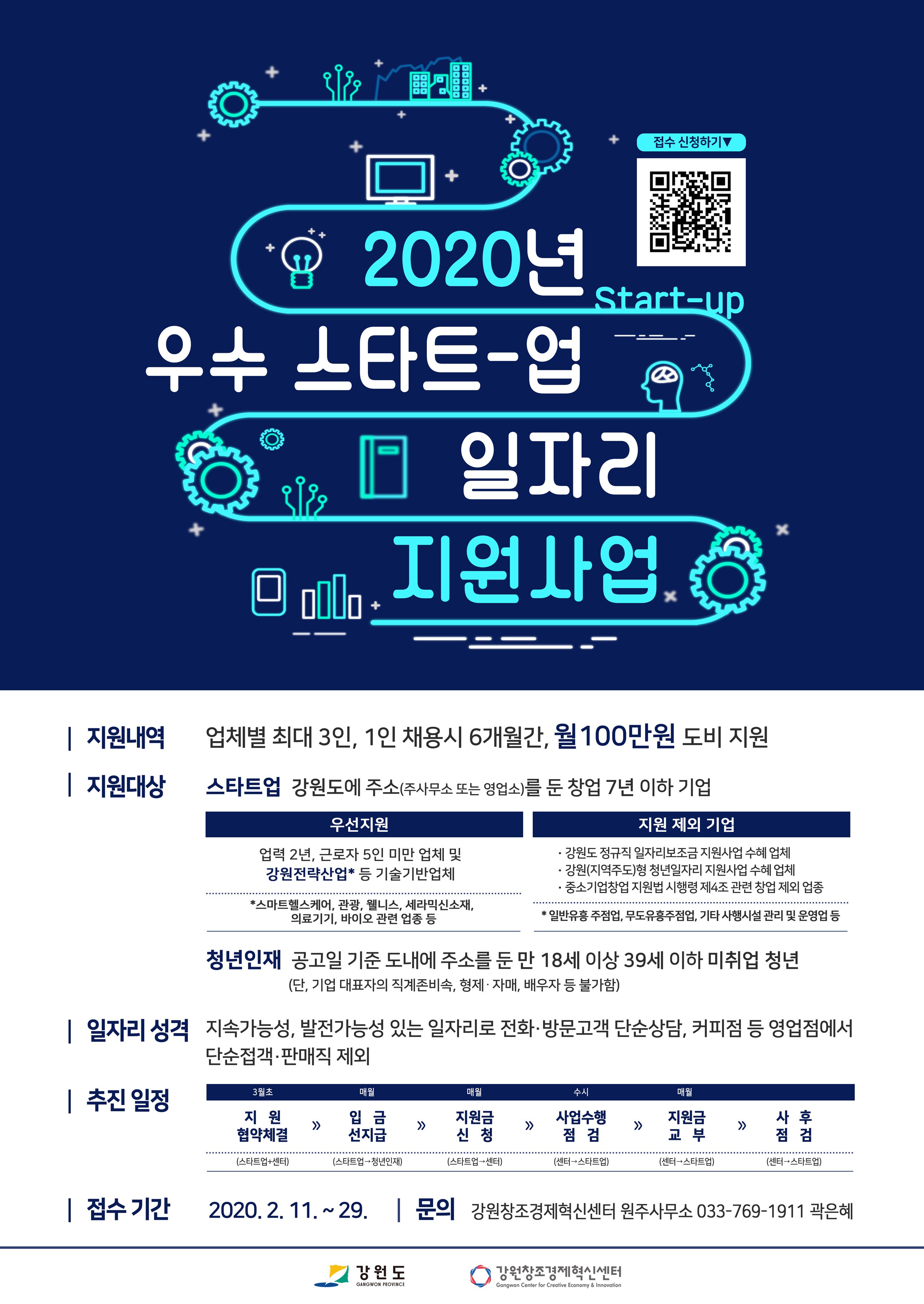강원도와 강원창조경제혁신센터는 도내 성장잠재력을 지닌 스타트업 기업에 우수한 청년인재가 근무할 수 있도록 우수 스타트업 일자리 지원사업을 진행하오니 많은 참여 바랍니다.