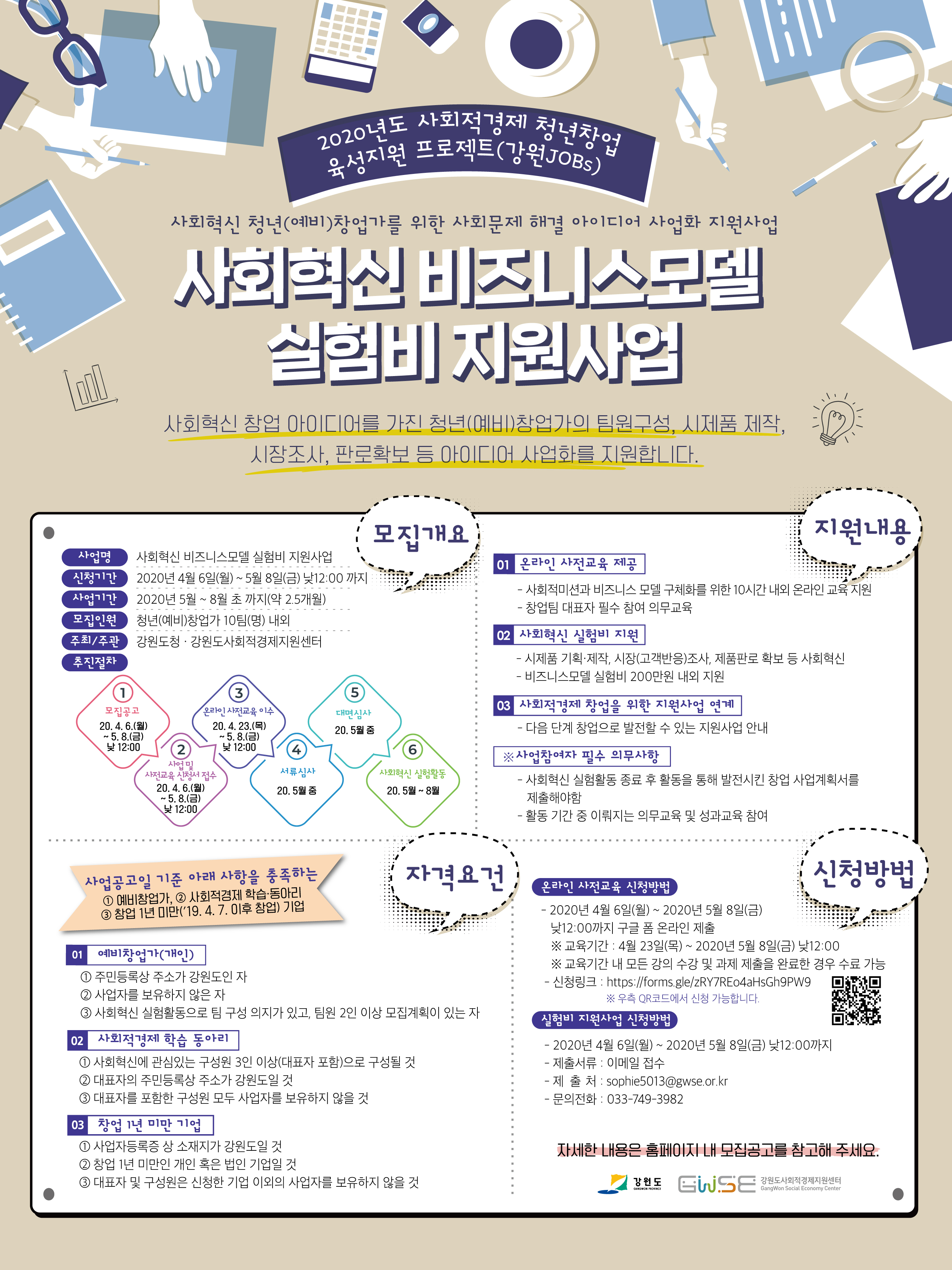 강원도사회적경제지원센터는 도내 사회문제 해결 아이디어를 보유한 청년(예비)창업가의 사회실험을 통한 사업계획 구체화를 지원하기 위해, 「사회혁신 비즈니스모델 실험비 지원사업」에 참여할 청년(예비)창업가 모집계획을 다음과 같이 공고합니다.