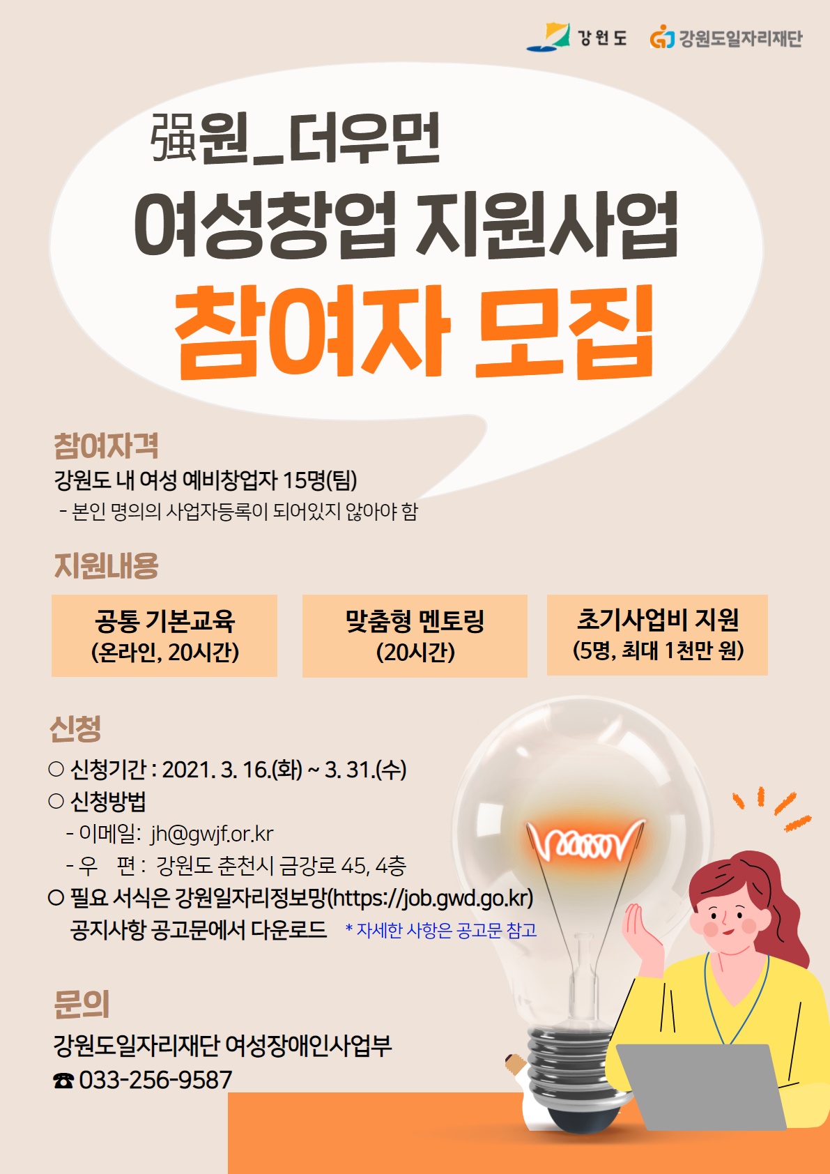 강원도일자리재단에서는 여성창업 성공모델 발굴 및 강원도 여성친화 창업생태계 조성을 위해 强원_더우먼 여성창업 지원사업에 참여할 여성 예비창업자를 모집하오니, 관심 있는 분들의 많은 참여 바랍니다.