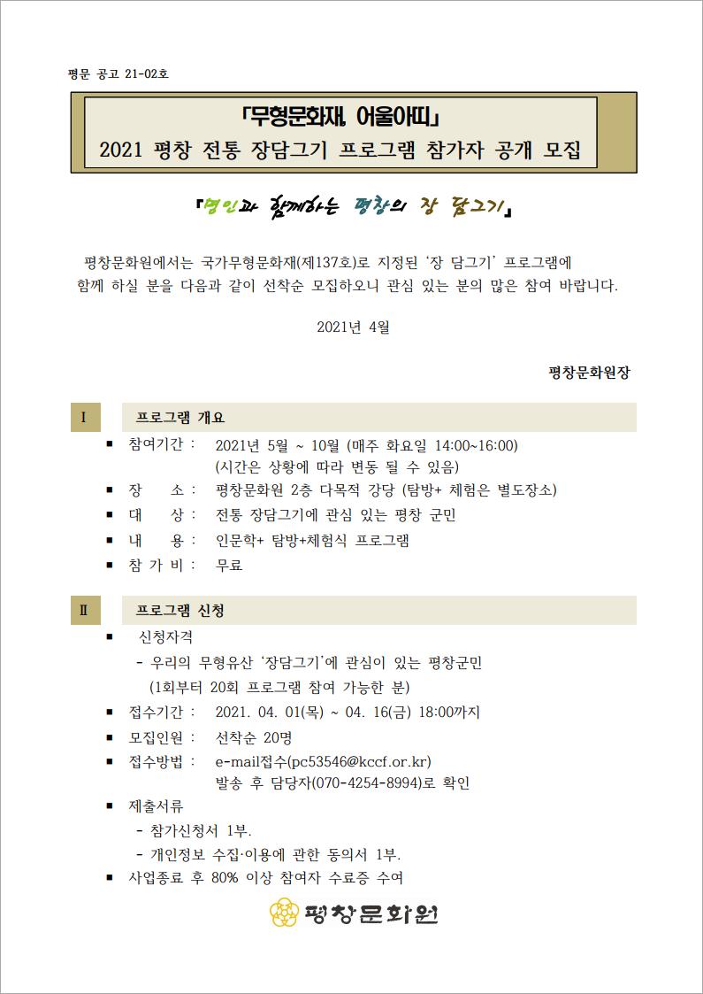 평창문화원에서는 국가무형문화재(제317호)로 지정된 '장 담그기' 프로그램에 함께 하실 분을 다음과 같이 선착순 모집하오니 관심 있는 분의 많은 참여 바랍니다.