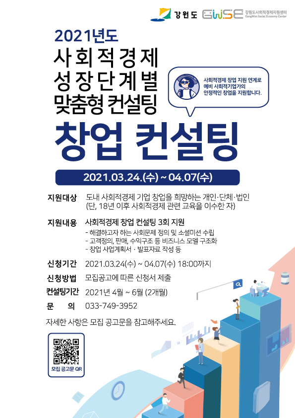 강원도사회적경제지원센터는 도내 예비 사회적기업가를 발굴하고 사회적경제 창업으로 연계하기 위해 「2021년도 사회적경제 성장단계별 맞춤형 컨설팅」창업컨설팅 참여자를 아래와 같이 모집합니다. 사회적경제기업 창업을 희망하는 도내 예비창업자들의 많은 참여 바랍니다.