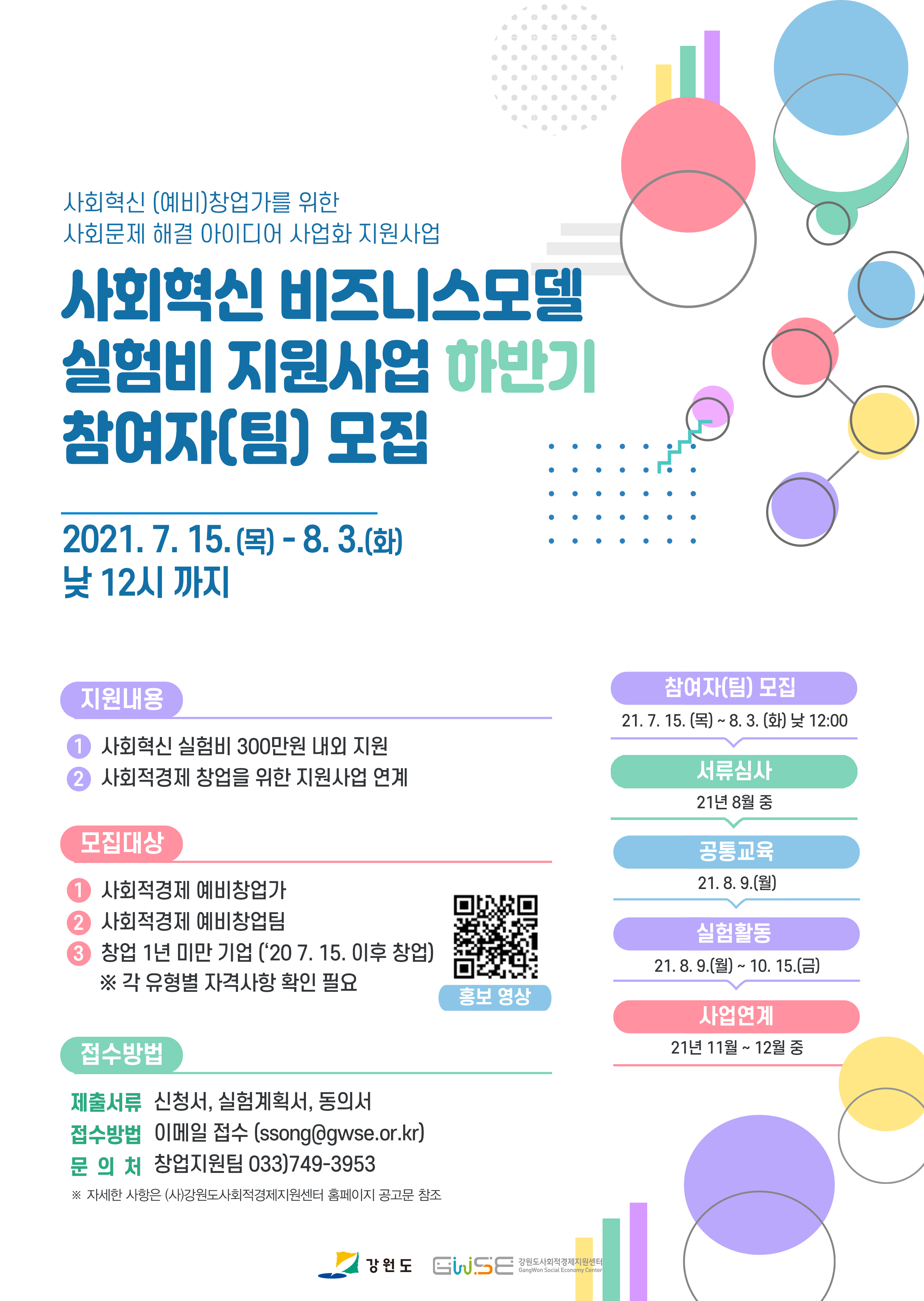 강원도사회적경제지원센터는 도내 사회문제 해결을 위한 아이디어 발굴과 실험 기회제공으로 예비 사회적기업가 양성 및 사회적경제분야 창업 활성화를 도모하기 위해 「2021년 사회혁신 비즈니스모델 실험비 지원사업(하반기)」에 참여할 (예비)창업가 모집계획을 다음과 같이 공고합니다.