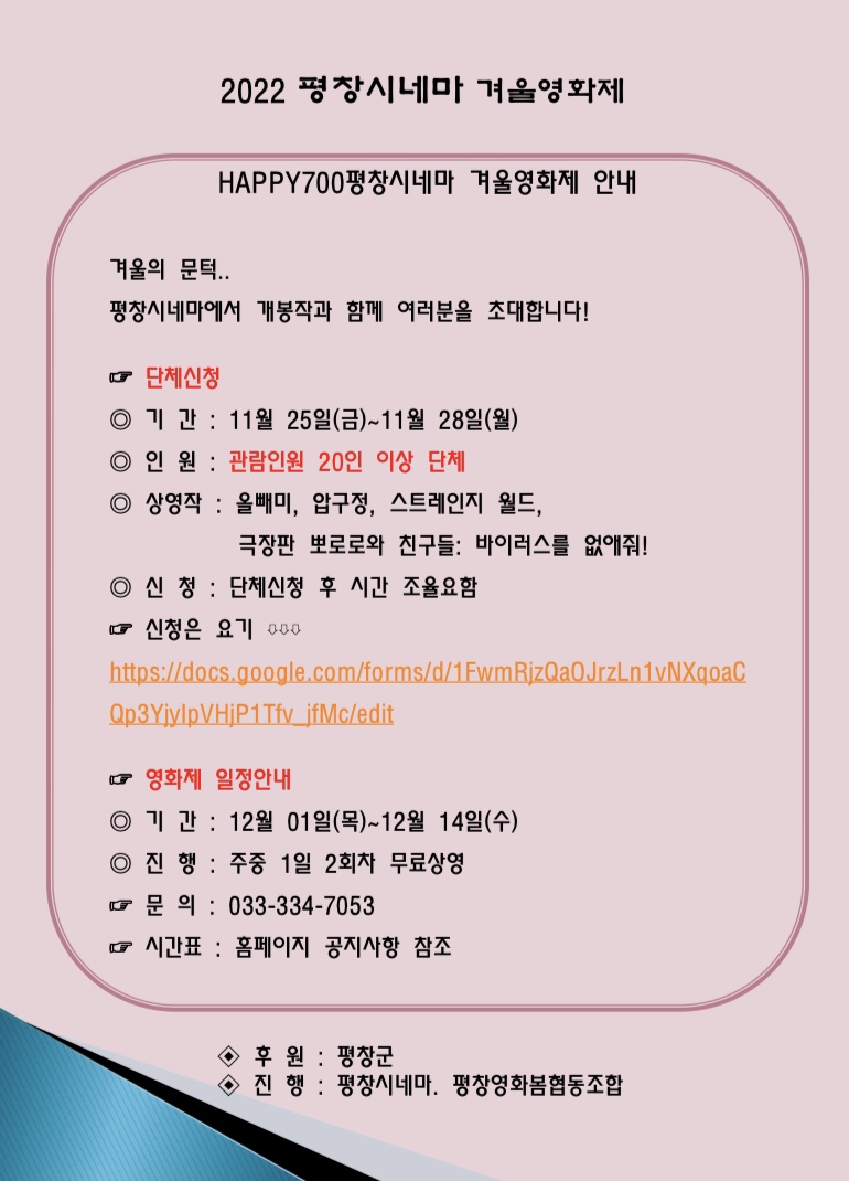 1. 행사명: 2022년 평창시네마 겨울영화제