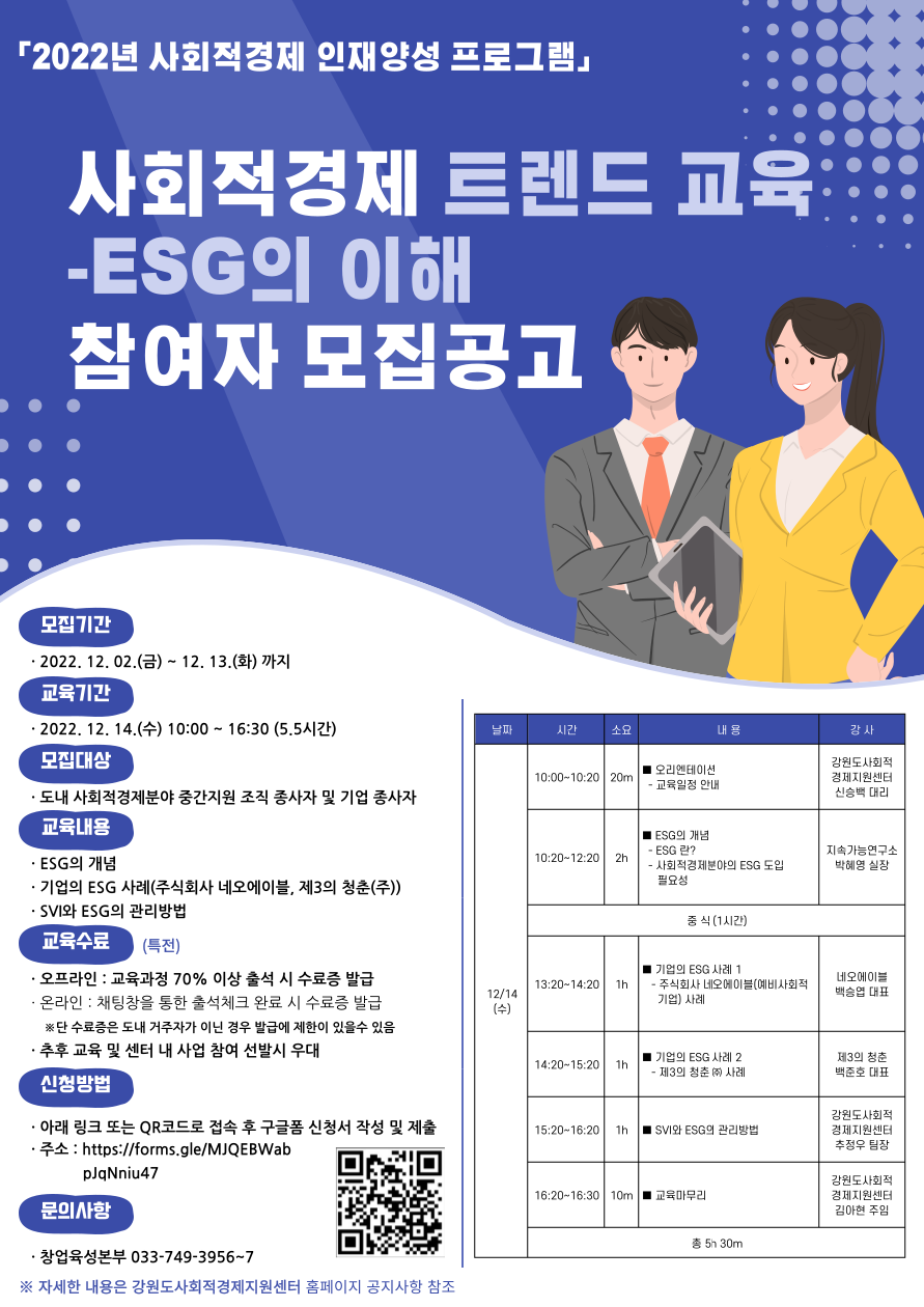 2022년 사회적경제 인재 양성 프로그램 「사회적경제 트렌드 교육-ESG의 이해」 수강생 모집공고