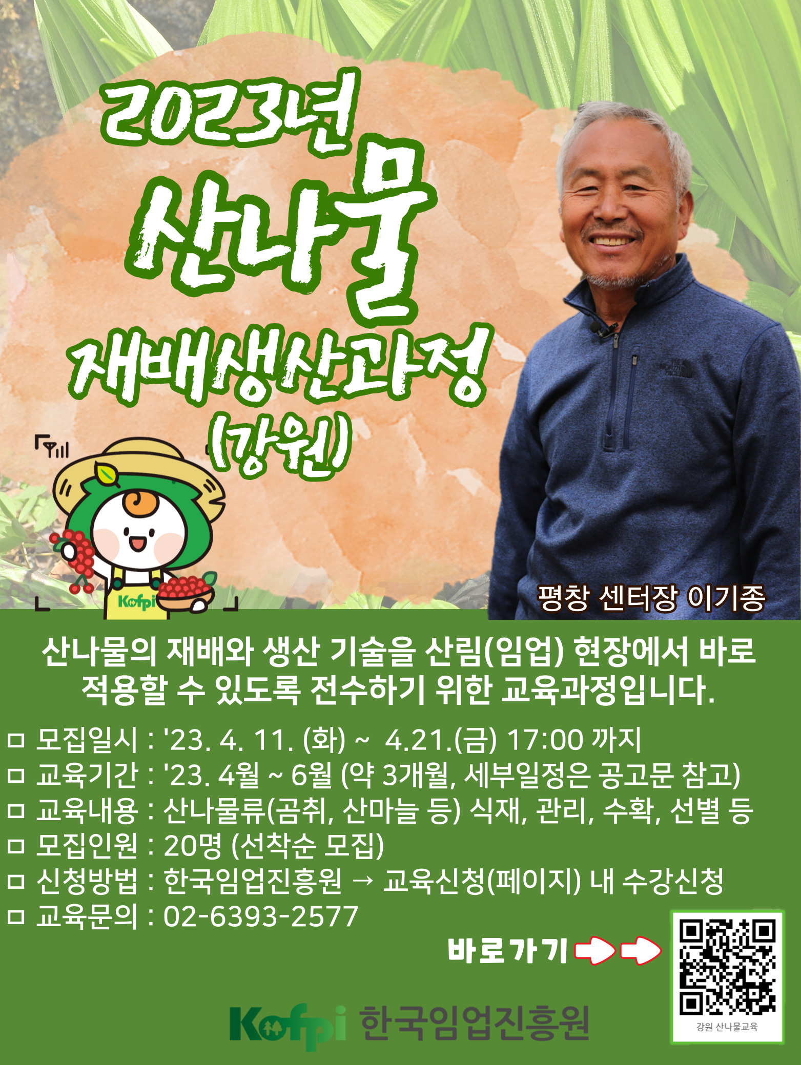 2023년「한국임업진흥원 산나물 재배생산 교육과정」교육생 모집 안내입니다.