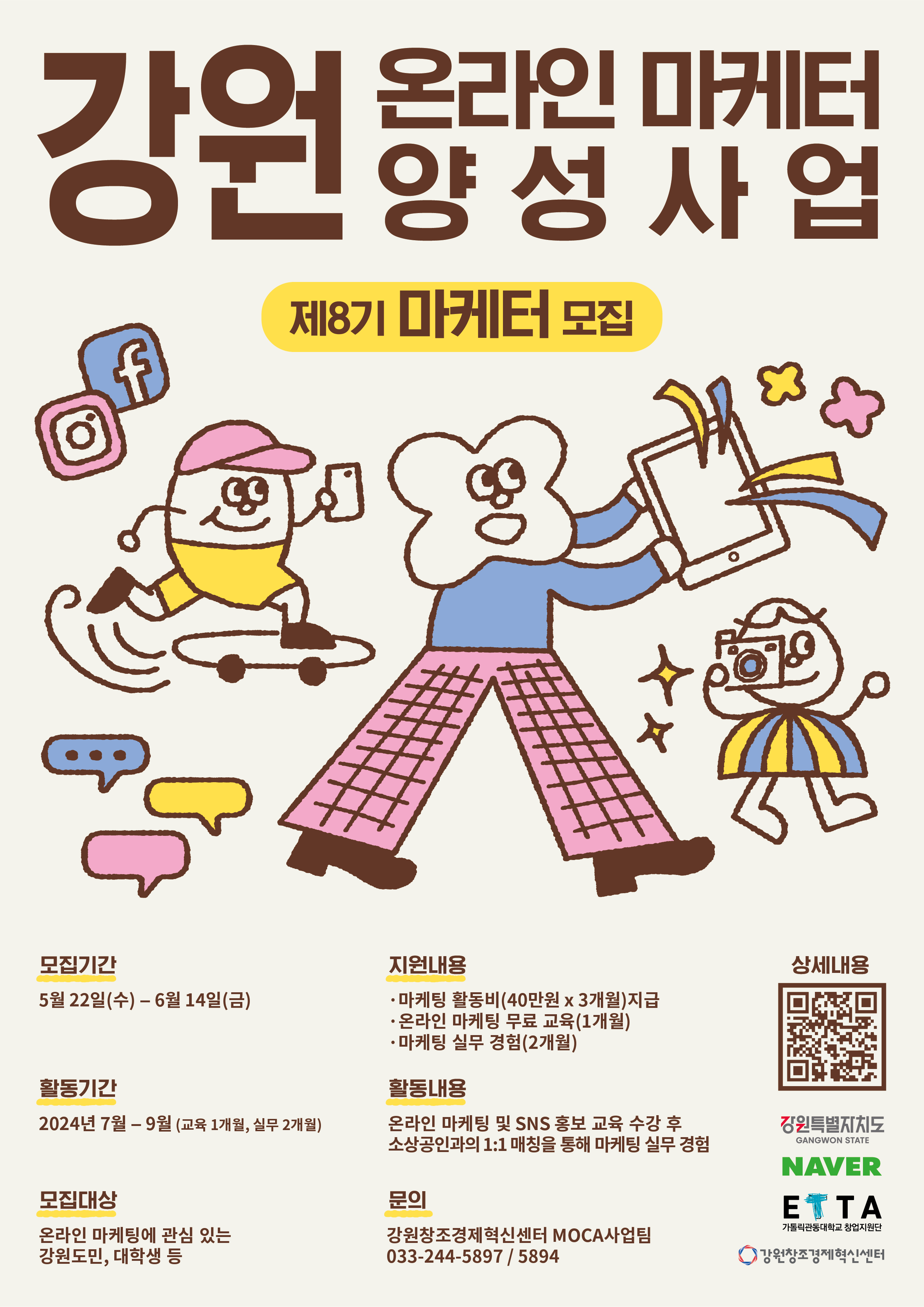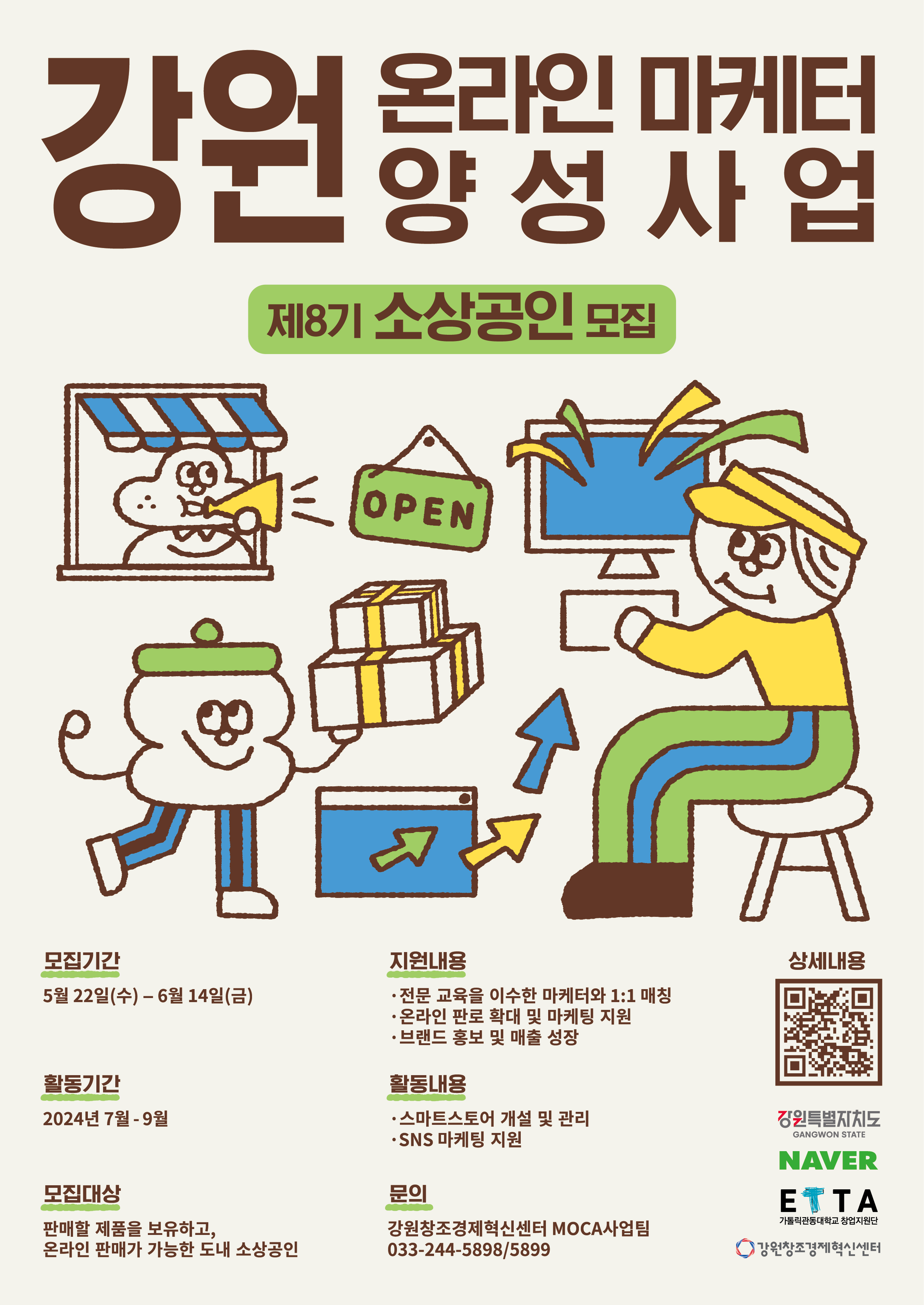 위와 관련하여 온라인 마케팅에 관심 있는 강원도민 및 대학생, 온라인 스토어 운영과 상품 홍보를 지원받고자 하는 도내 소상공인들의 적극적인 참여 요청드립니다.