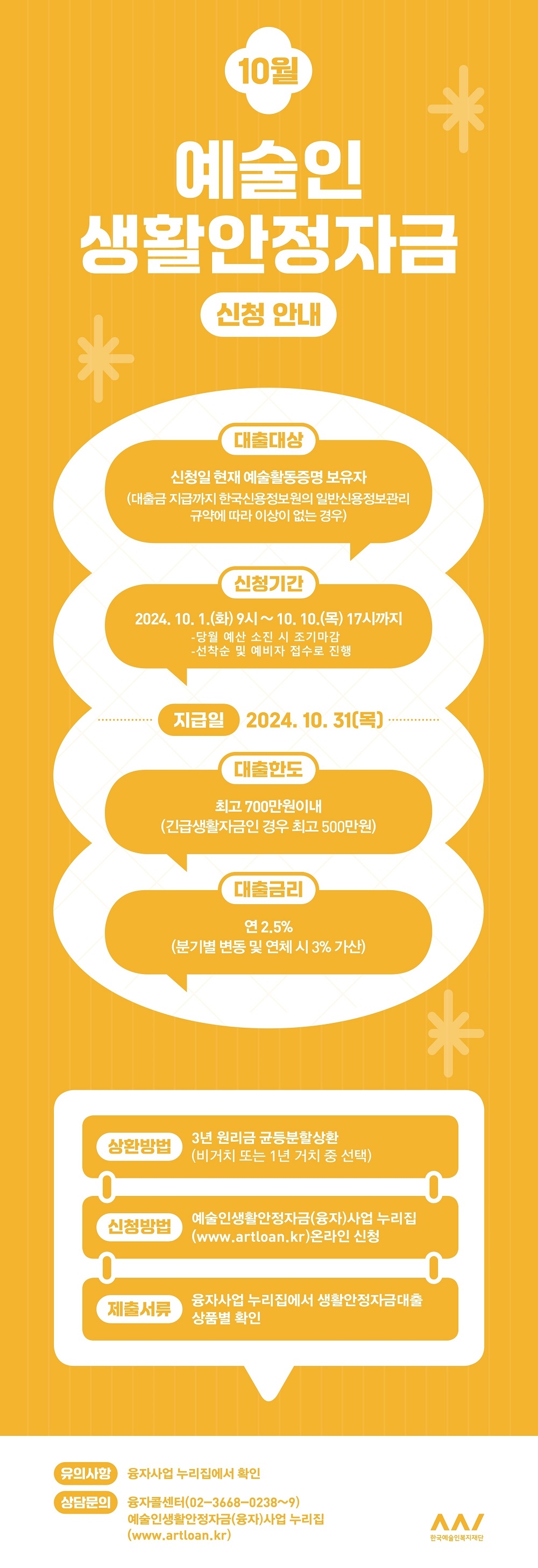 한국예술인복지재단 10월 예술인생활안정자금(융자) 사업 홍보