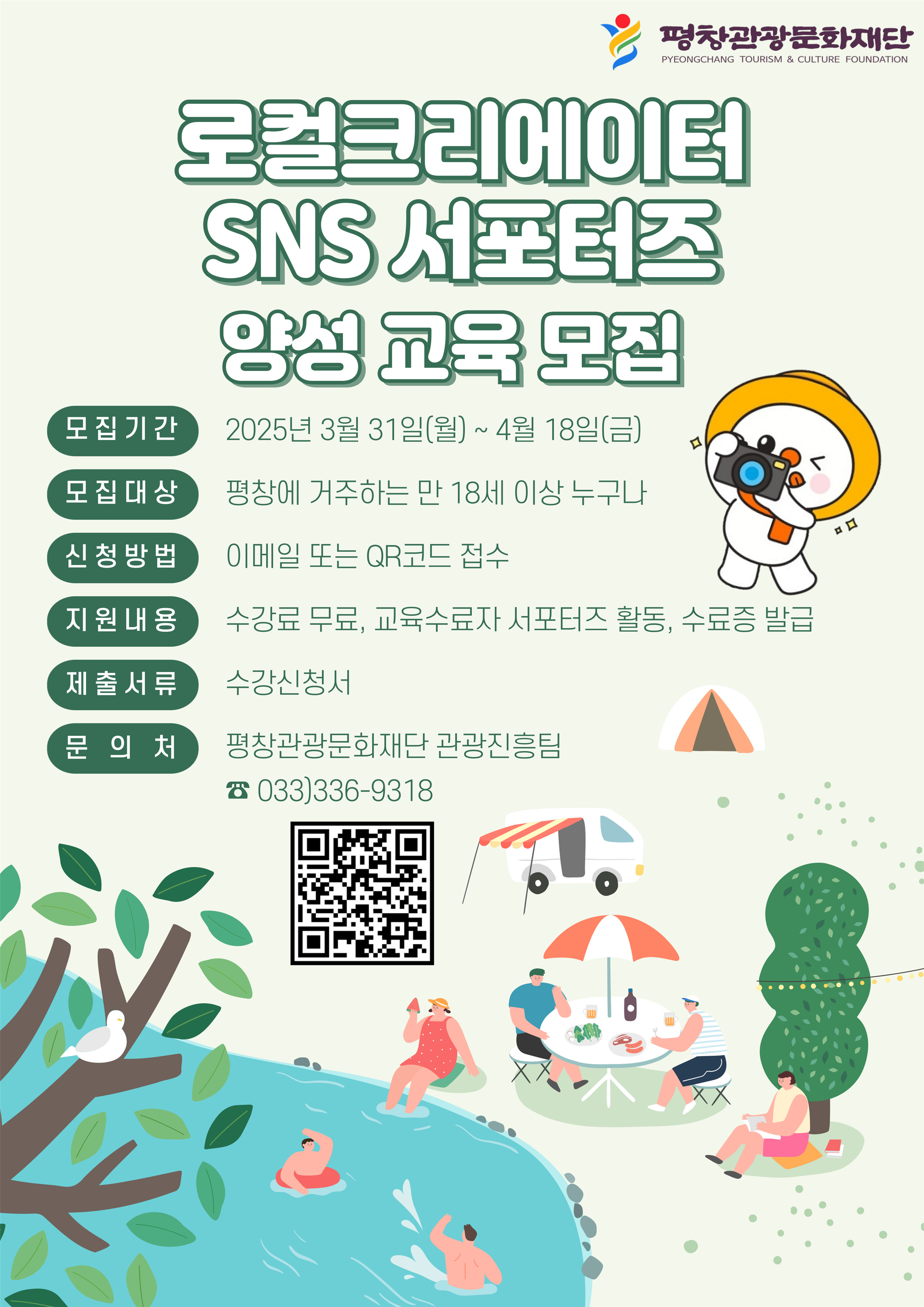 (재)평창관광문화재단에서 로컬크리에이터 SNS 서포터즈 양성교육을 다음과 같이 모집하오니 지원 부탁드립니다.