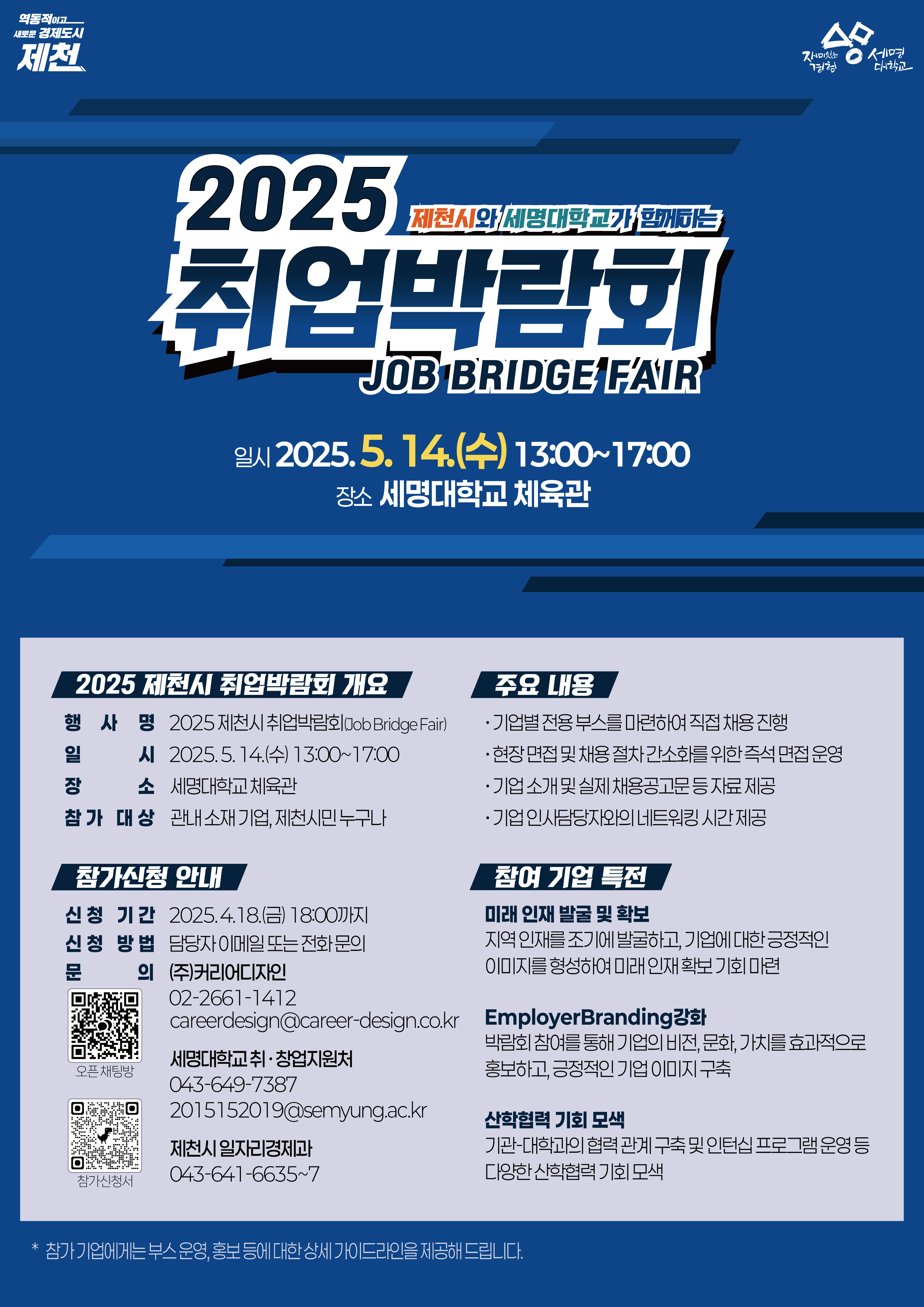제천시에서는 다양한 취업정보 제공과 우수인재 채용기회 확대로 구인·구직 미스매치를 해소하기 위하여 「2025 제천시 취업박람회」를 다음과 같이 개최하오니 관심있는 구직자(졸업예정자)는 참가 바랍니다.