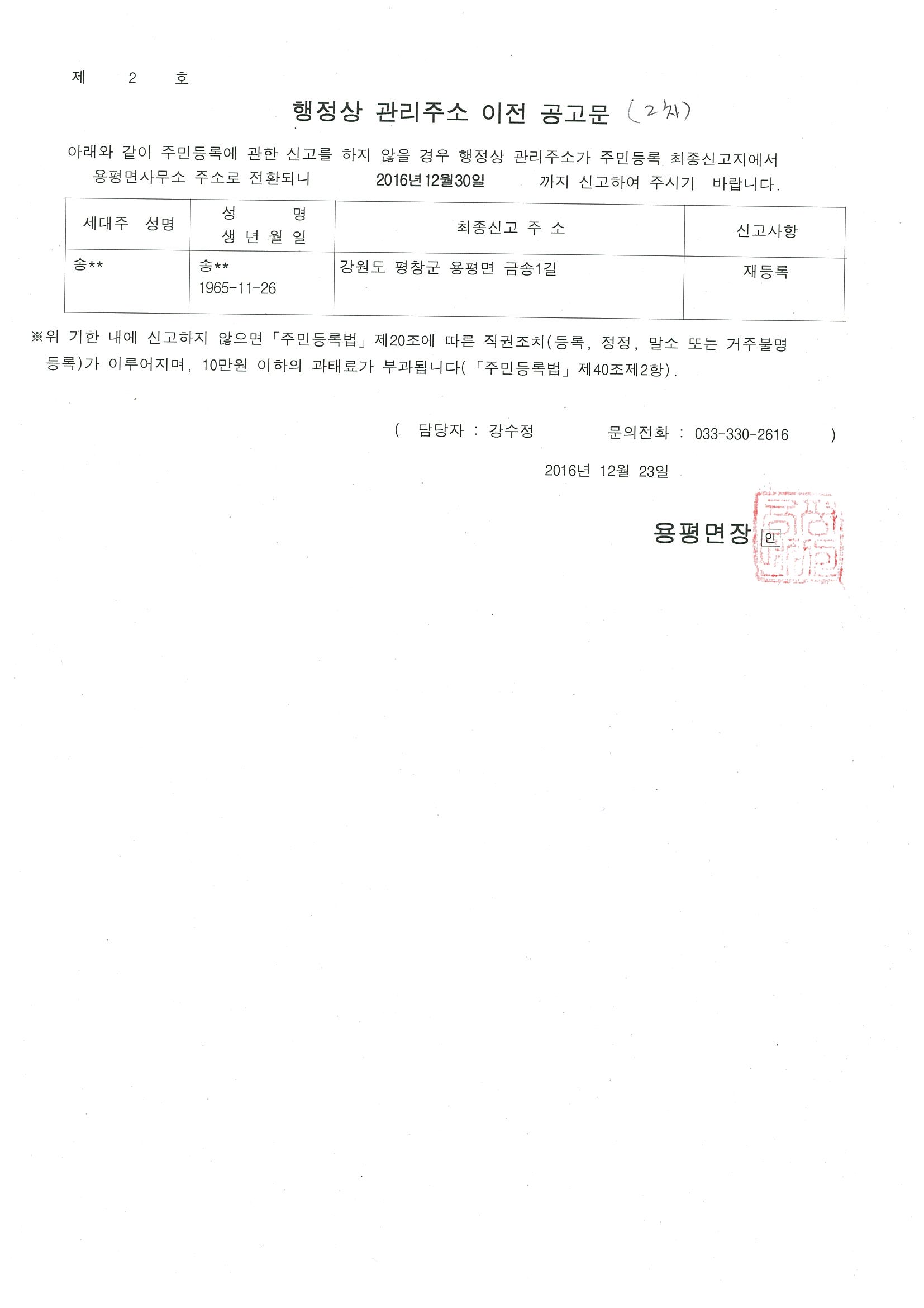 주민등록법 제20조에 따른 거주불명등록자의 행정상 관리주소를 주민등록상 주소지에서 면사무소로 전환하기 위해 다음과 같이 공고하고자 합니다.