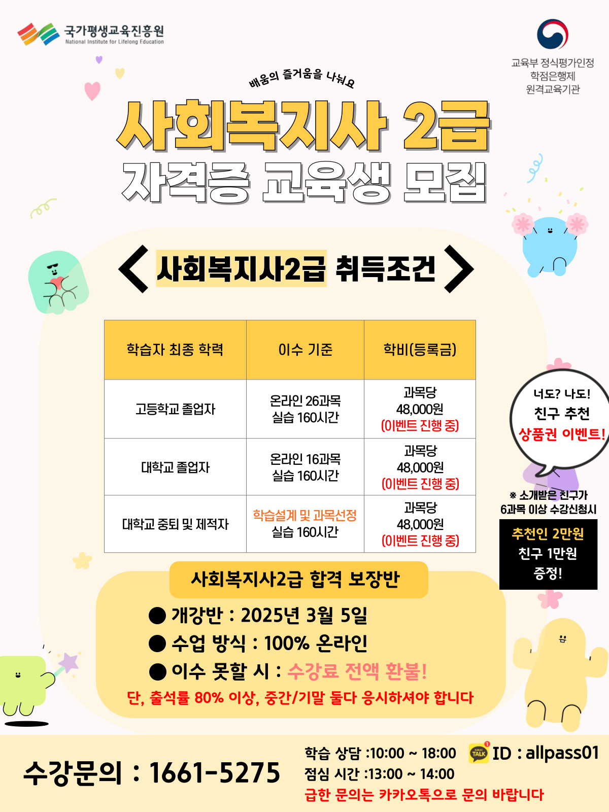 2025년 사회복지사 합격보장반 교육생 모집(무시험)