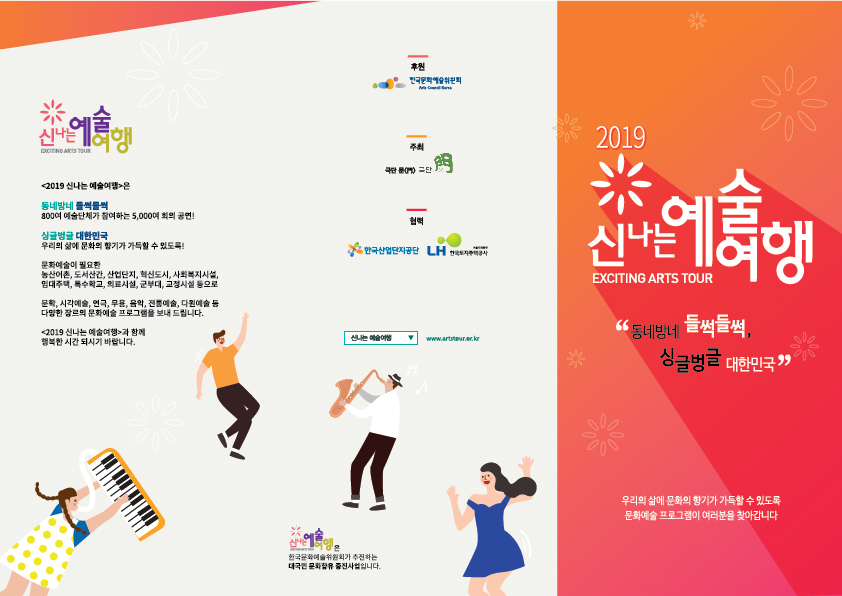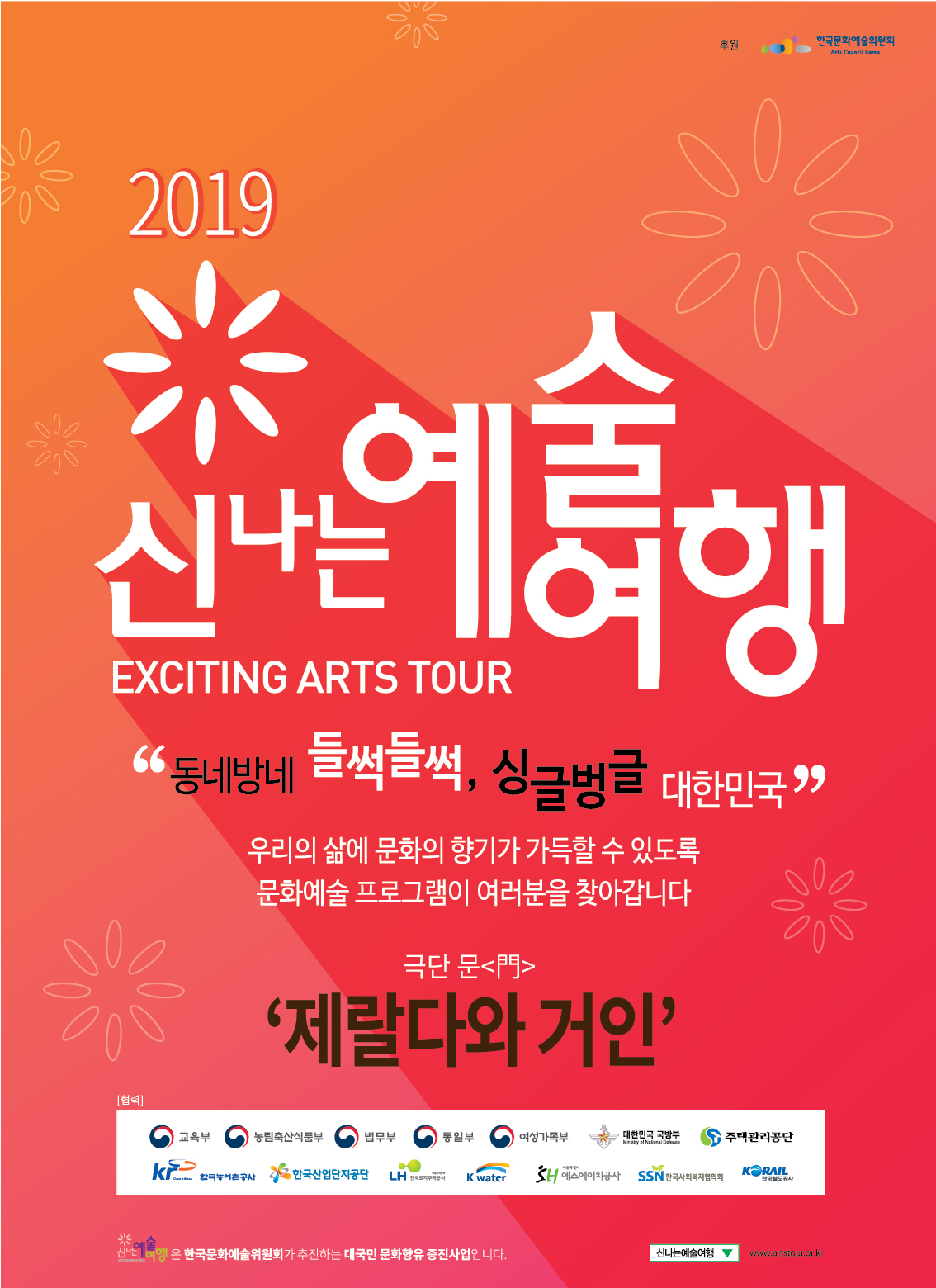 한국문화예술위원회가 후원하는 2019 신나는 예술여행은 문화 기반이 부족한 곳에 문화예술 공연을 제공하는 대국민 문화향유 증진사업으로 더 많은 국민이 더 많은 문화적 혜택을 누릴 수 있도록 다양한 방안들을 마련하고 있다.