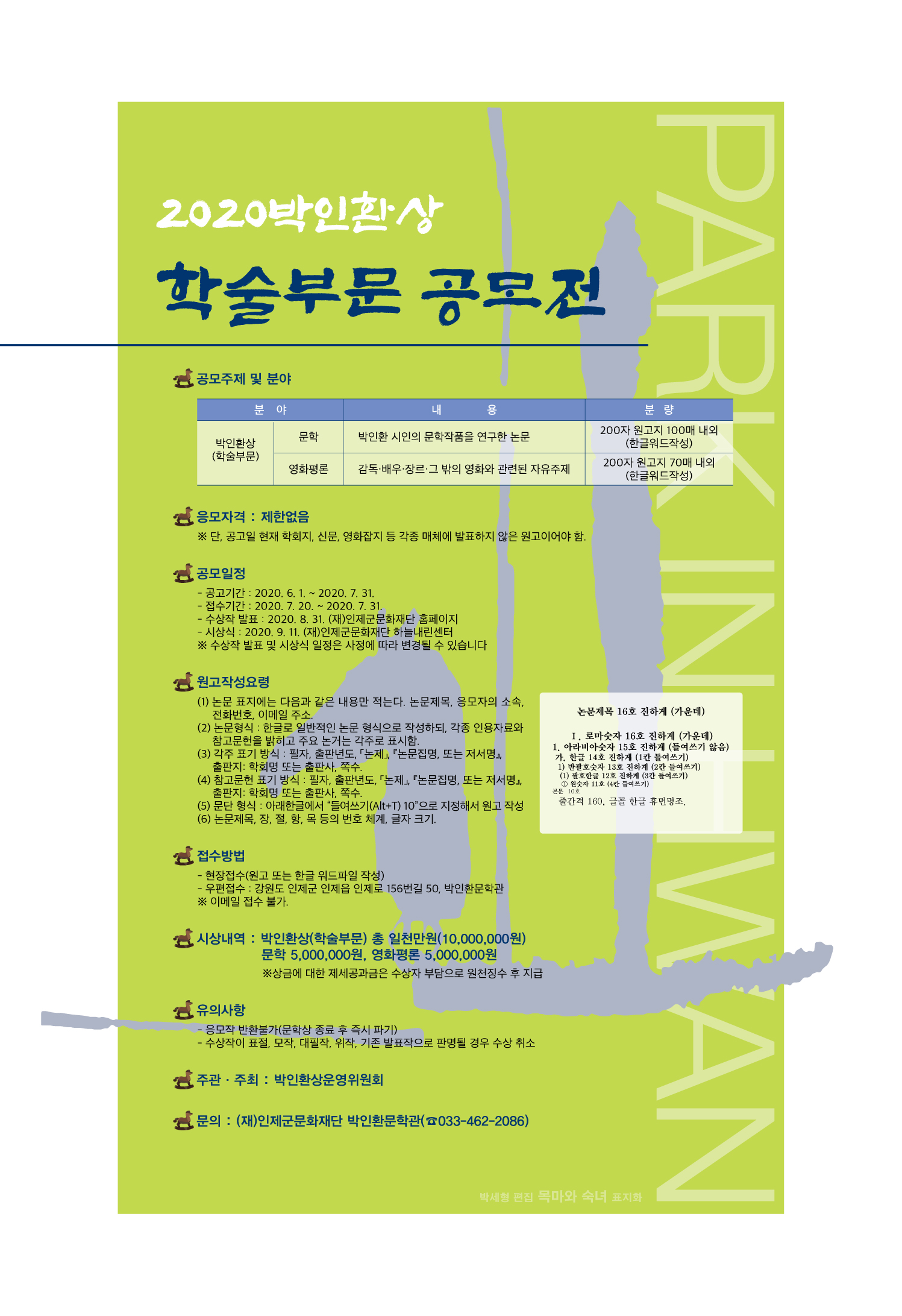 • 수상작 발표 : 2020년 8월 31일 (재)인제군문화재단 홈페이지 - http://www.injeart.or.kr/