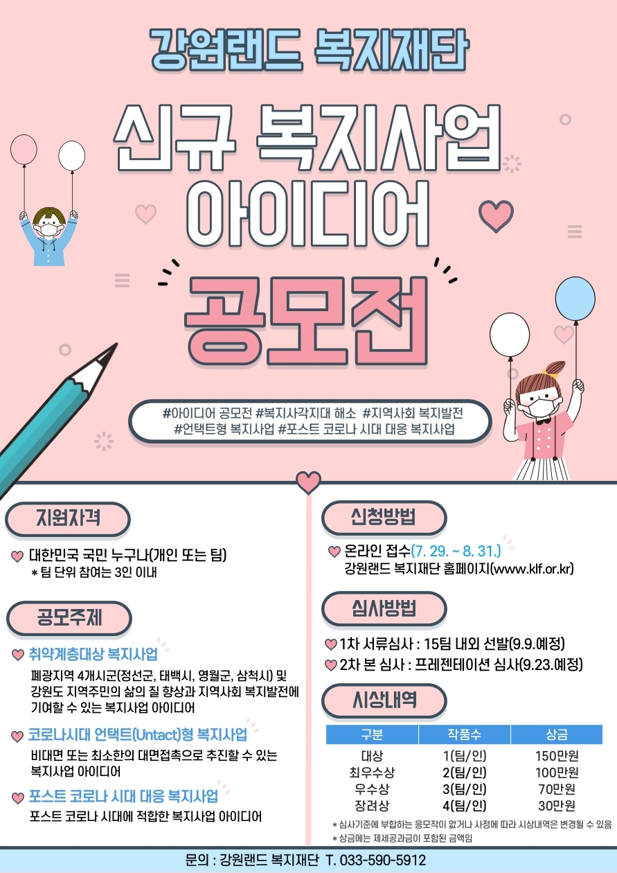 강원랜드 복지재단 에서는 취약계층대상 복지사업, 언택트형 복지사업, 포스트 코로나 시대에 대응하기 위한 복지사업이라는 3가지 주제에 대해 신규 복지사업 아이디어를 공모합니다.