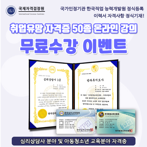 심리상담사 분야 및 아동청소년 교육분야 50여종 자격과정 온라인 강의 전액무료수강 이벤트를 실시합니다.