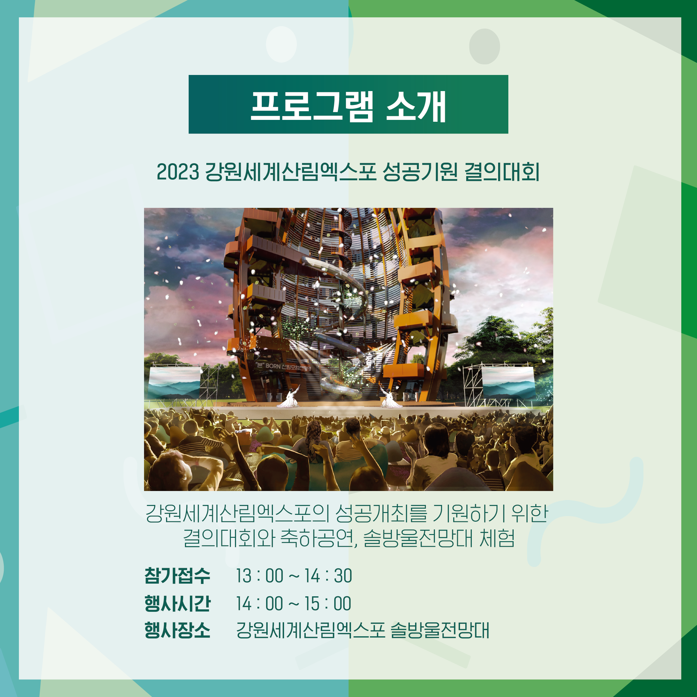 2023강원세계산림엑스포 D-100 숲길 걷기대회는 강원특별자치도 성공 출범을 기념하고, 고성 속초 인제 양양 일원에서 개최되는 산림엑스포에 대한 전 국민적 관심을 모으기 위해 마련했습니다.