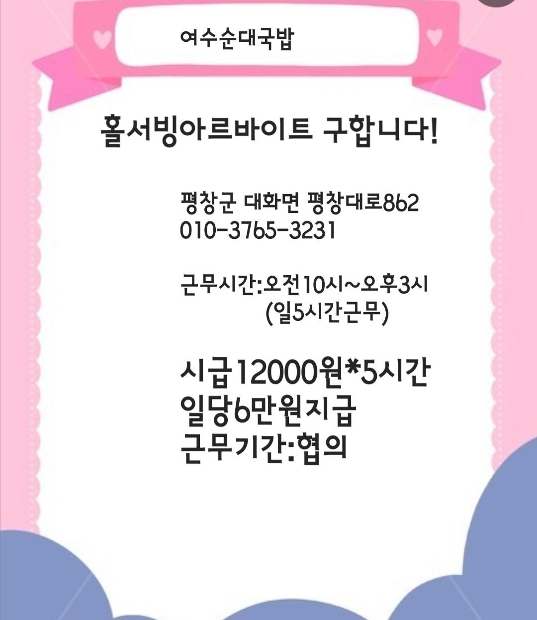여수순대국밥 구인중(평창군 대화면 평창대로 862)