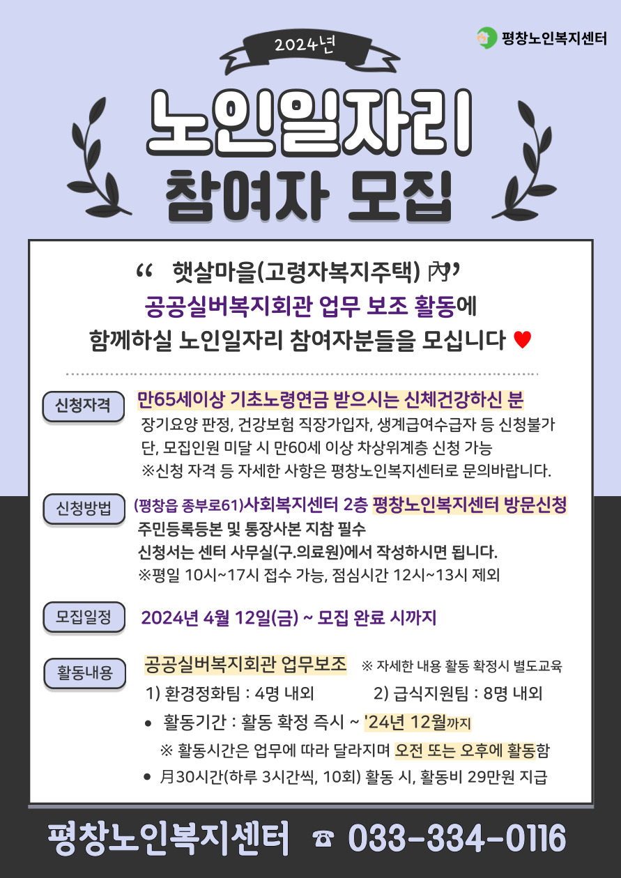 공공실버복지회관(종부 고령자복지주택 內) 노인일자리 참여자 모집합니다