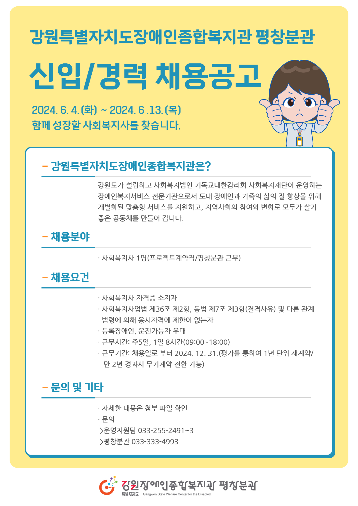 강원특별자치도장애인종합복지관 평창분관에는 장애인들과 함께 행복한 지역사회를 만들어갈 사회복지사를 채용합니다.