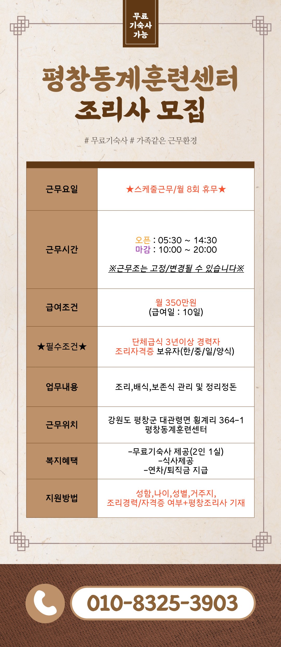 ★평창동계훈련센터★경력직 조리사 모집합니다!(조리경력자/조리자격증 보유자)