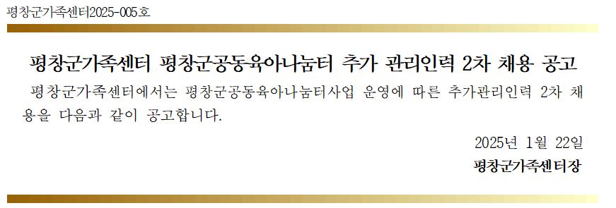 평창군공동육아나눔터 추가관리인력 채용 공고