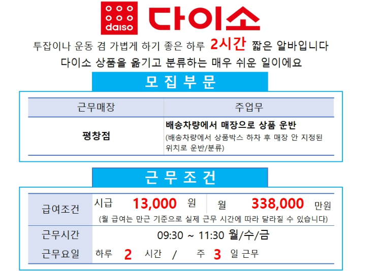 [다이소 평창점]월/수/금 2시간 알바구합니다.