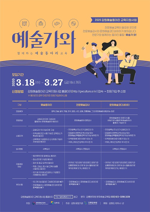 모집대상 : 강원도를 기반으로 활동하는 예술동아리, 전문예술강사, 문화예술코디네이터