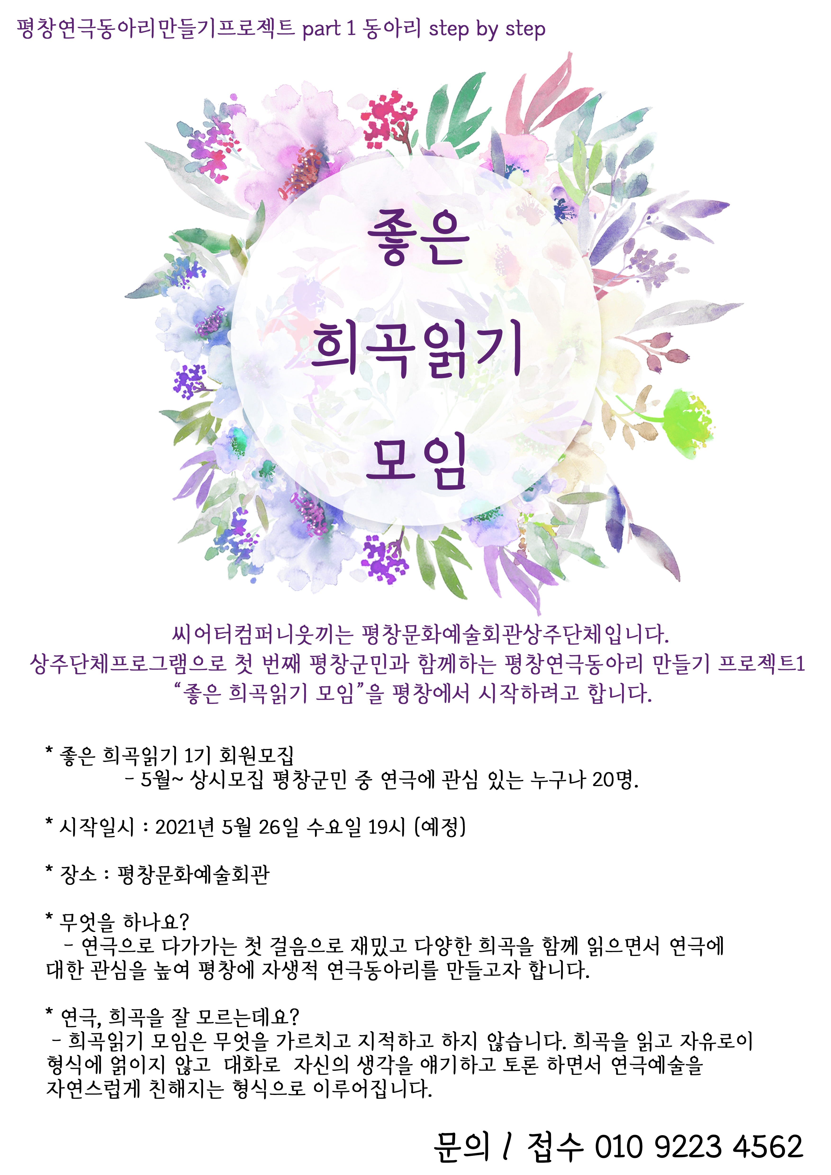 상주단체프로그램으로 첫 번째 평창연극동아리 만들기 프로젝트좋은 희곡읽기 모임을 평창에서 시작하려고 합니다.