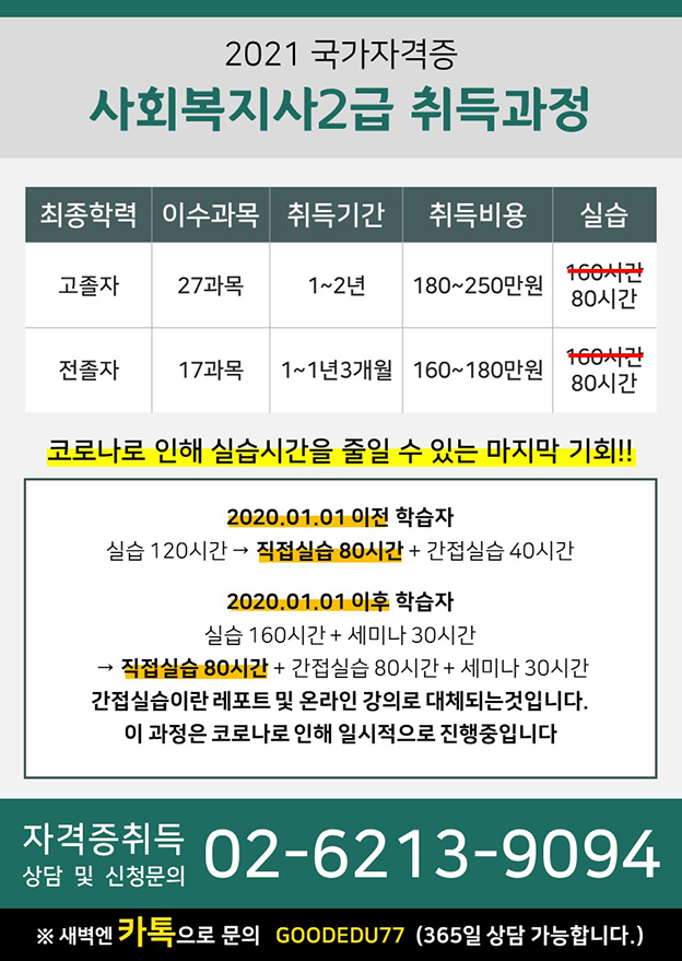 ★[국가자격증]사회복지사2급자격증 국가고시로 개정 전 마지막으로 쉽게 취득할 수 있는 기회 ★