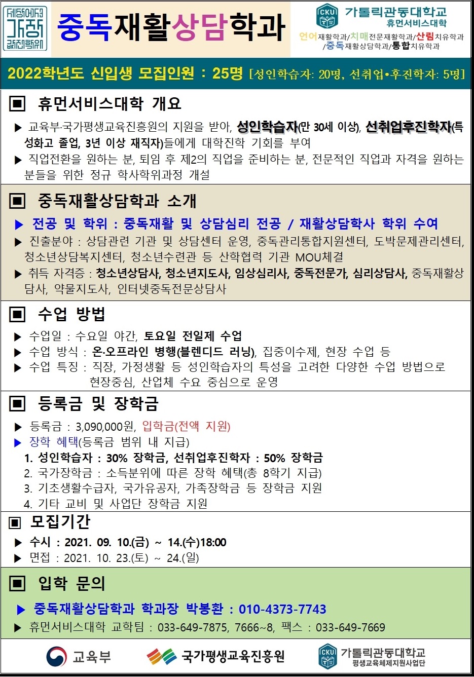▶ 휴먼서비스대학 교학팀 : 033-649-7875, 7666~8, 팩스 : 033-649-7669