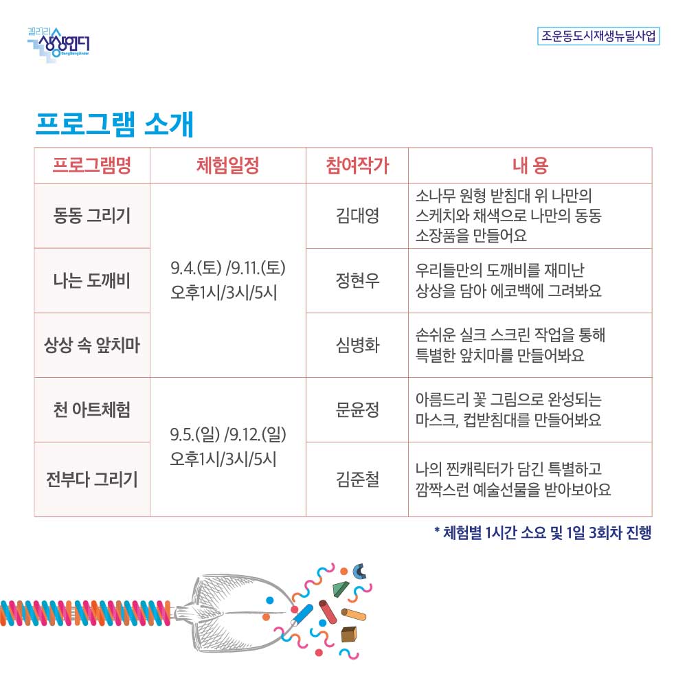 · 체험내용 : 동동그리기, 천아트체험, 동화상상, 나는 도깨비, 전부다 그리기, 상상 속 앞치마