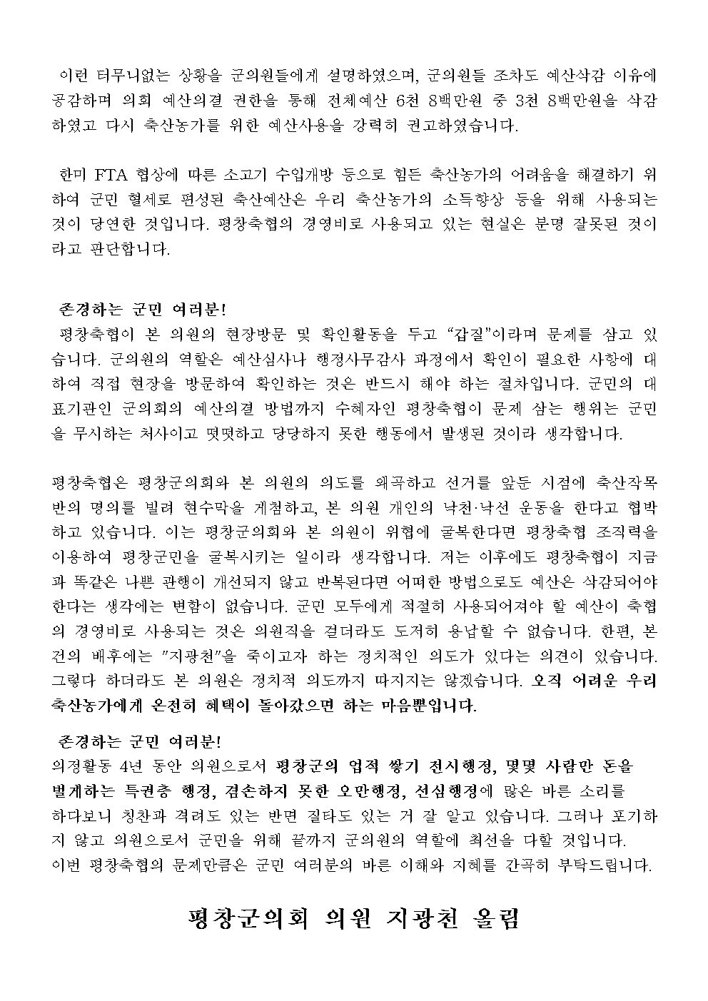 군민 여러분께 최근 평창축협의 예산삭감 현수막 게첨과 관련