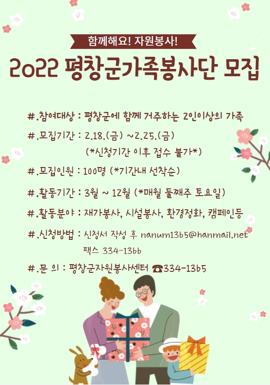 평창군자원봉사센터에서는 "2022평창군가족봉사단" 모집을 2.25(금)일까지 메일또는 팩스로 접수합니다.
