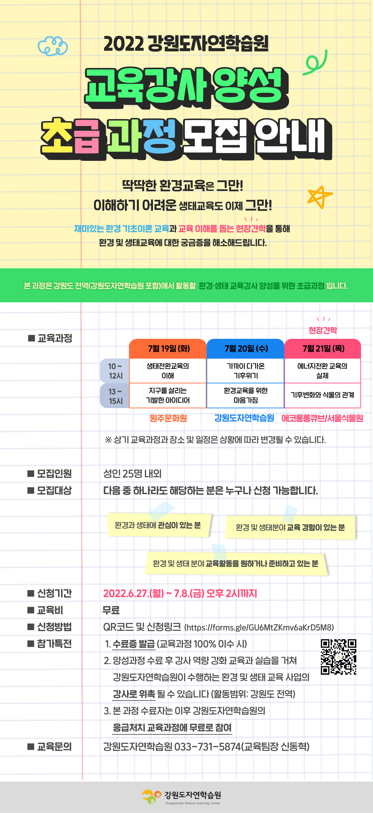 강원도자연학습원(강원도환경교육센터)에서 다양한 환경·생태 교육 및 체험프로그램 ‘ 교육강사 양성 초급과정’을 마련했습니다. 환경과 생태 교육분야에 관심있는 많은 분들의 참가를 기다립니다.