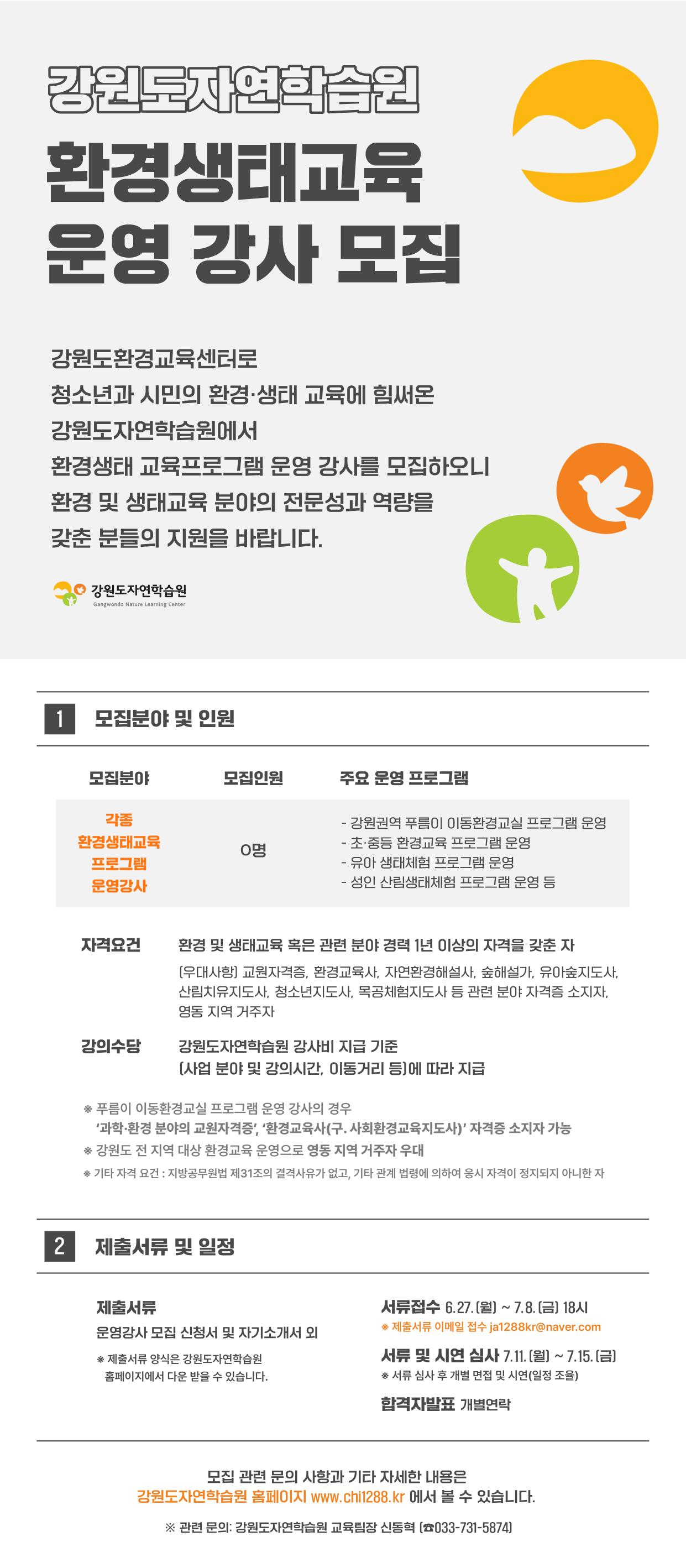 강원도자연학습원은 강원도 전역에 걸쳐 다양한 환경·생태 교육프로그램을 개발, 운영 및 보급하는 강원도환경교육센터로, 각종 교육 및 체험프로그램 운영 강사를 모집합니다.