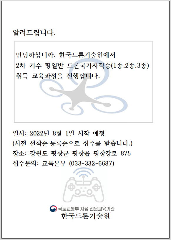 한국드론기술원 교육본부 033-332-6687로 연락.