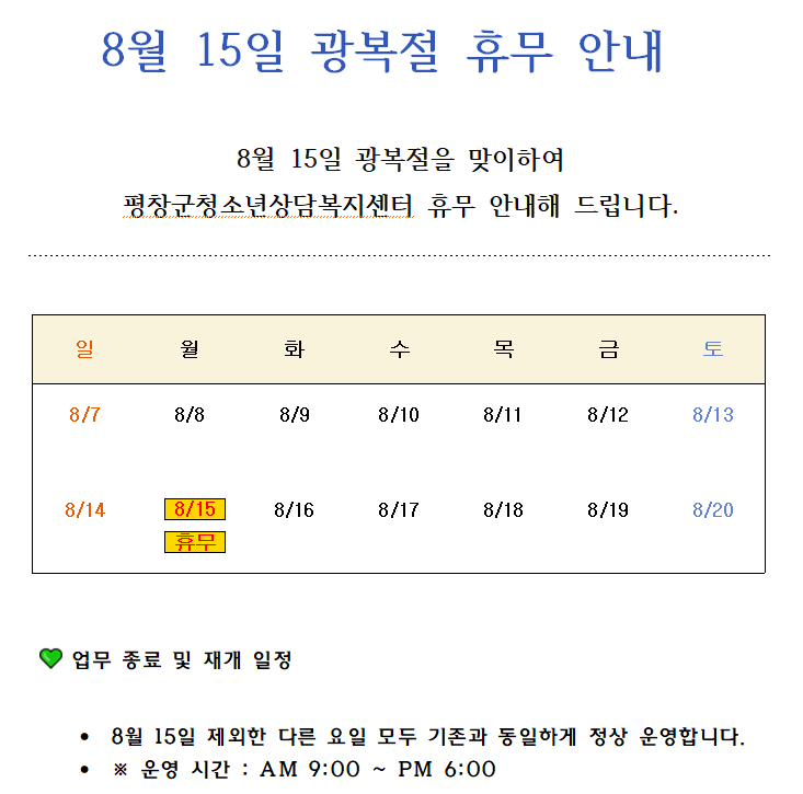 8월 15일 관복정을 맞이하여 센터 휴무 안내 드립니다.