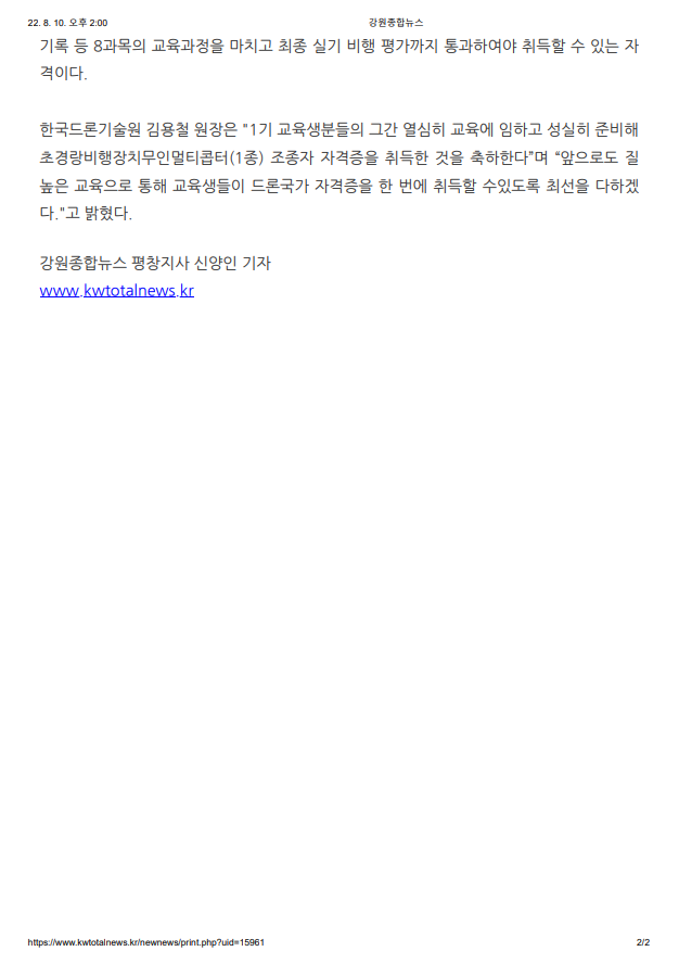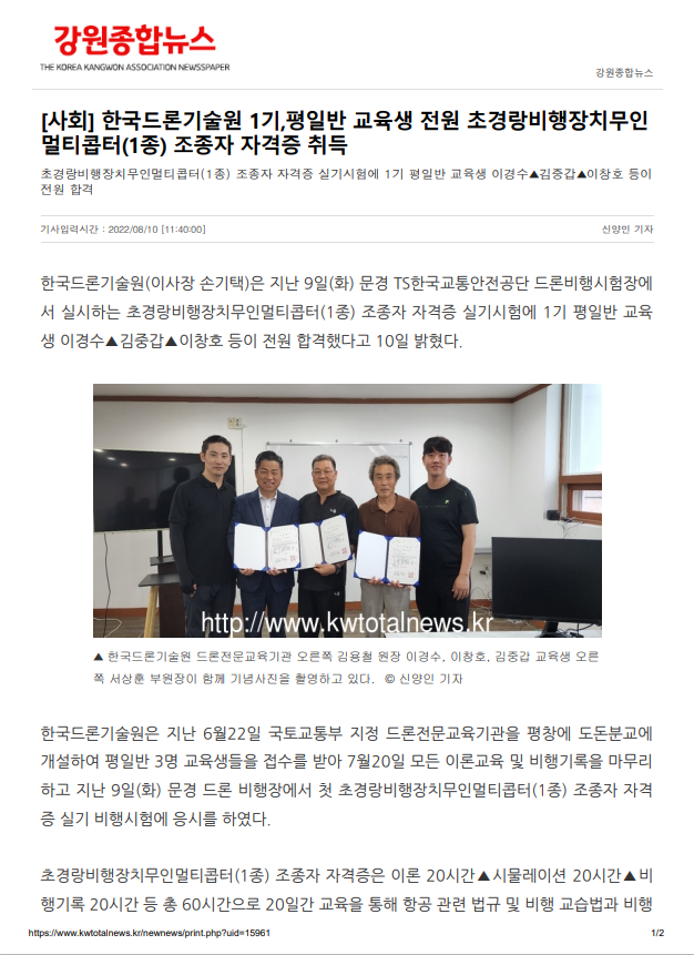 평창군 한국드론기술원 1차기수 교육생 '전원합격' 기사가 보도되었습니다.