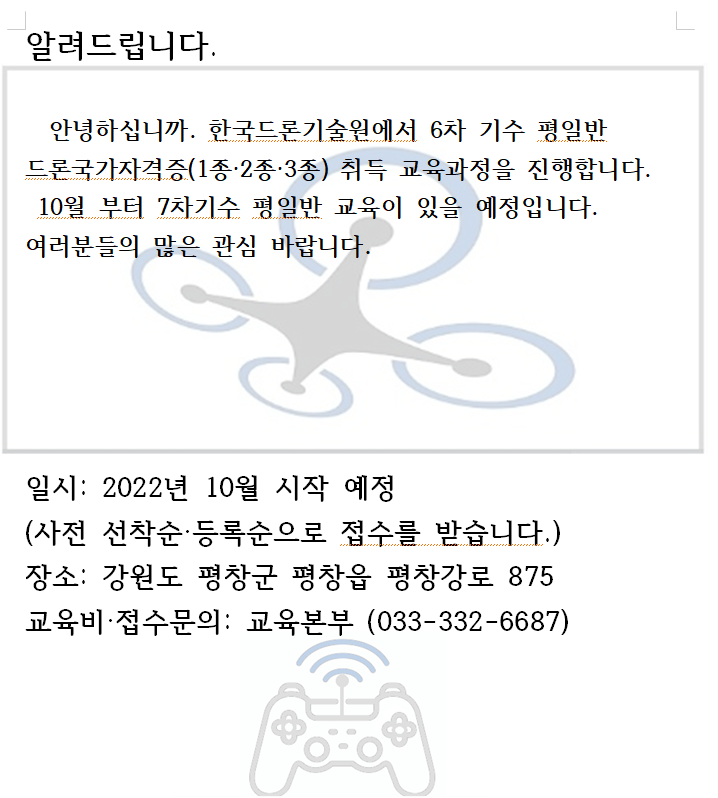 한국드론기술원 교육본부 033-332-6687로 연락.