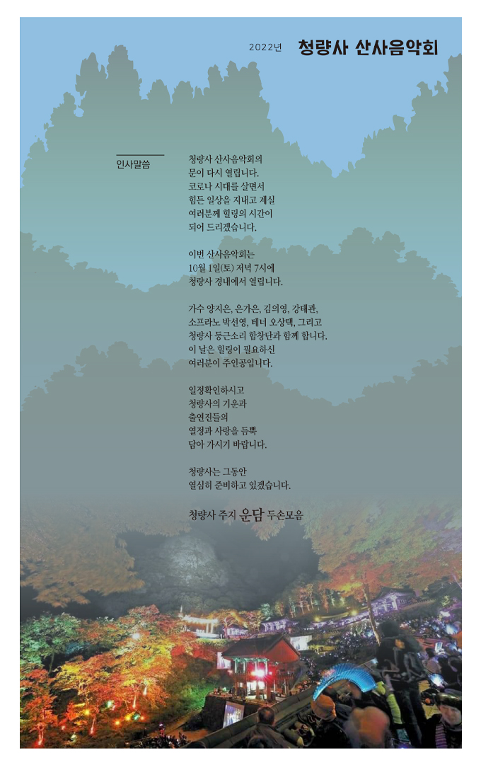일정 확인하시고 청량사의 기운과 출연진들의 열정과 사랑을 듬뿍 담아 가시기 바랍니다.