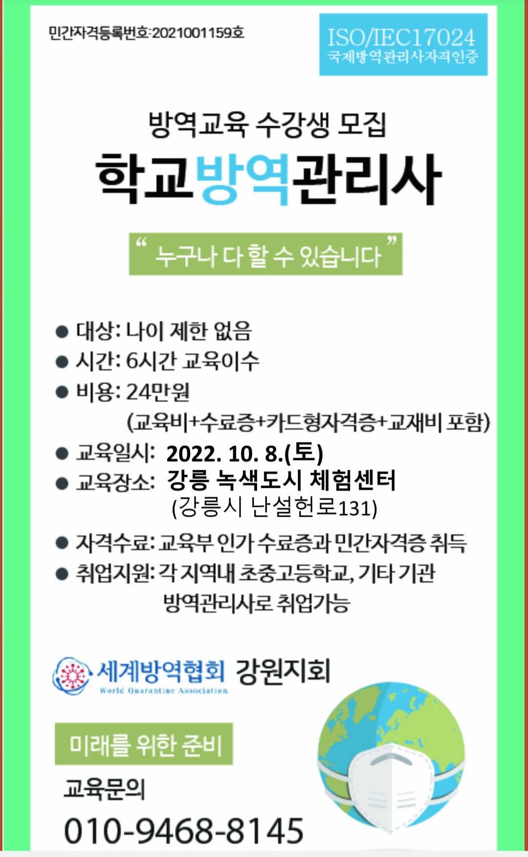 ●학교방역 관리사 자격취득을 위한 강원 지역 10월교육 안내 ●