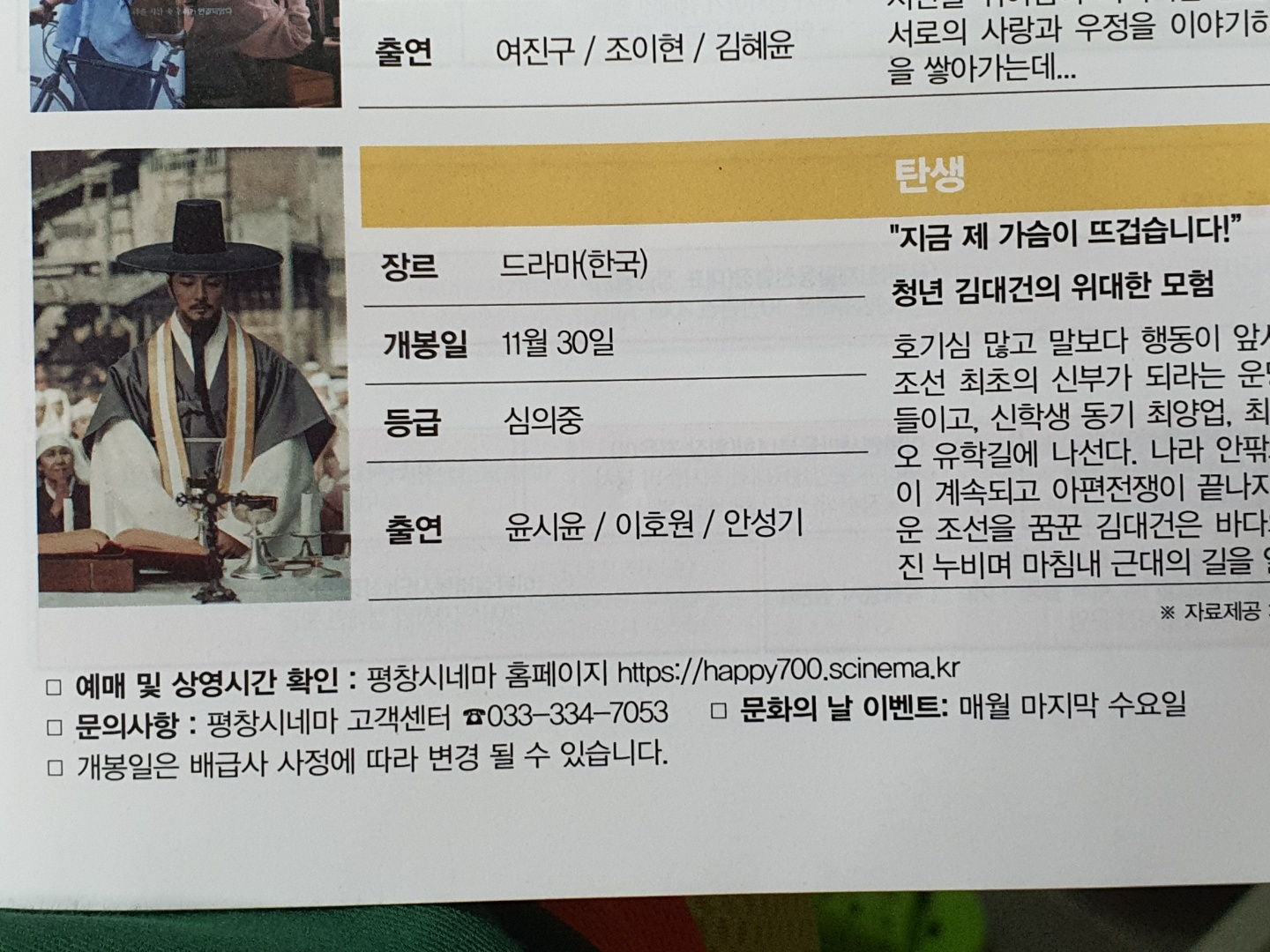 평창군청의 평창이야기에서 11월30일 개봉예정 영화로 소개한 "탄생" 을 평창시네마에서 이날 개봉 안 한다고 합니다.